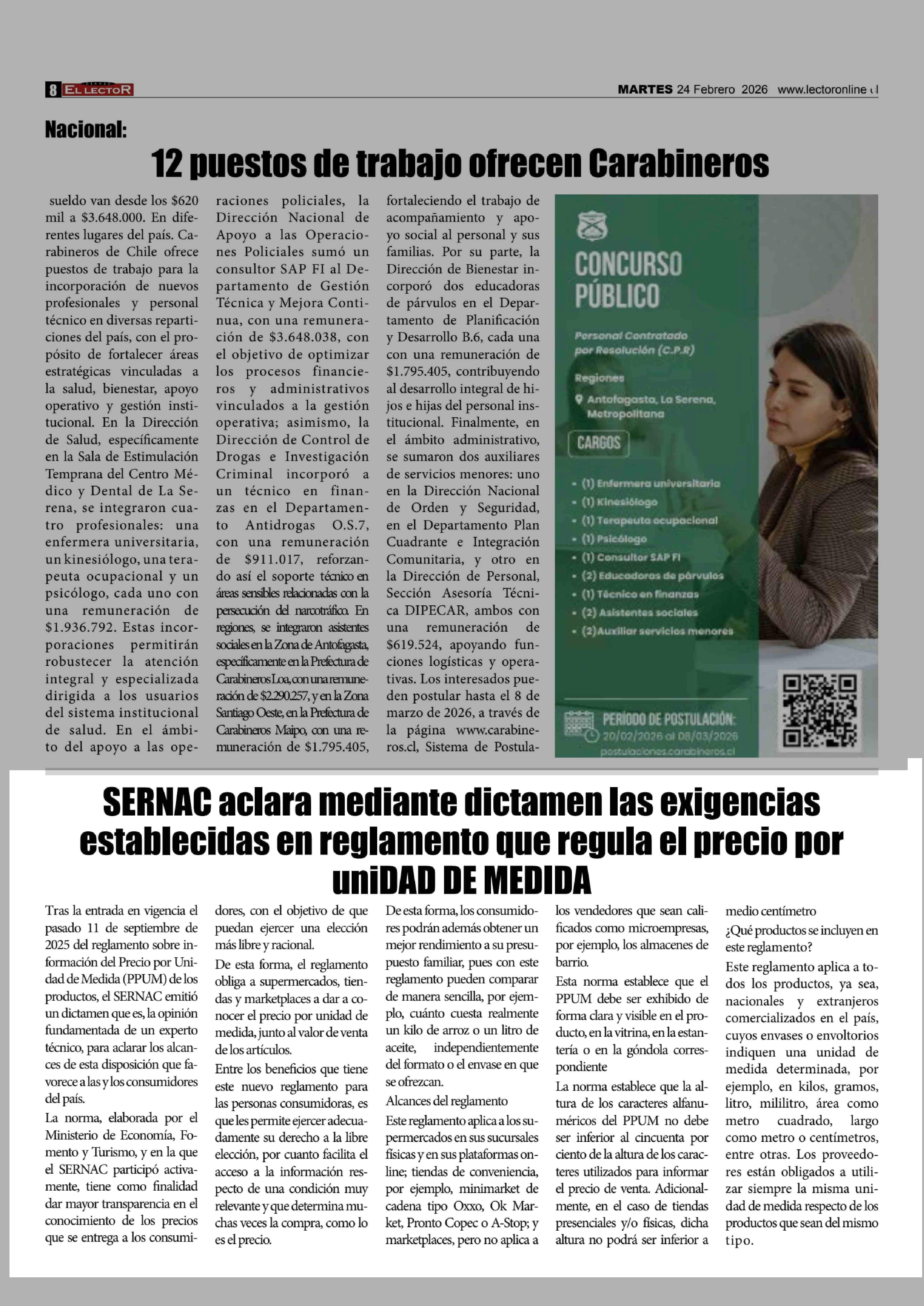 SERNAC aclara mediante dictamen las exigencias establecitdas en reglamento que regula el precio por uniDAD DE MEDIDA 24-02-2026 El Lector |