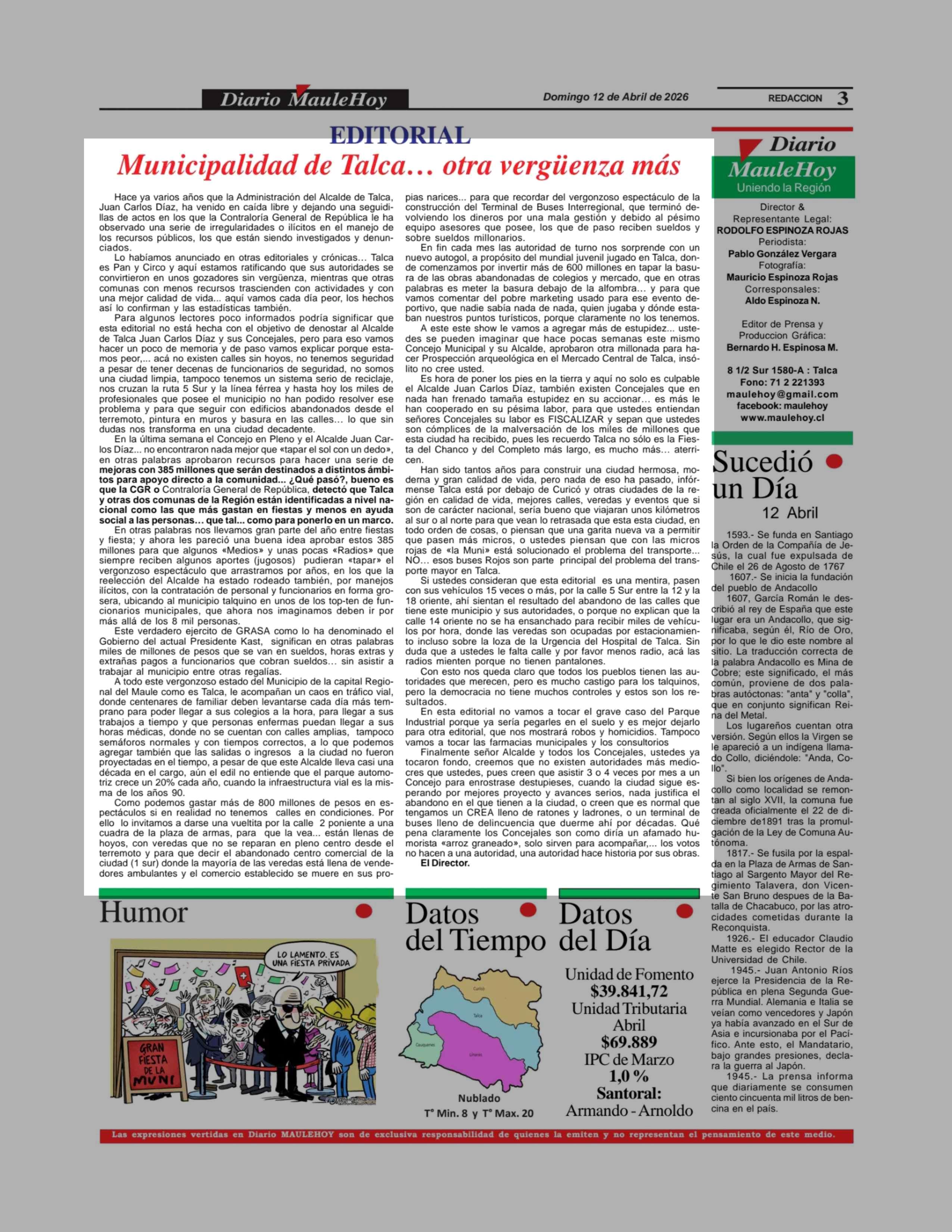 Editorial: Municipalidad de Talca ... otra vergüenza más 12-04-2026 Maule Hoy |