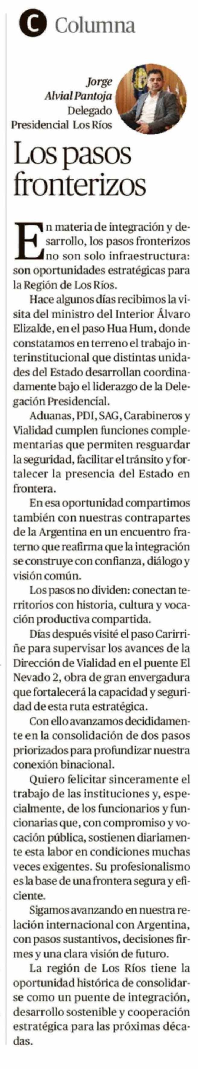 Columnas de Opinión: Los pasos fronterizos 21-02-2026 Diario Austral Región de Los Ríos |