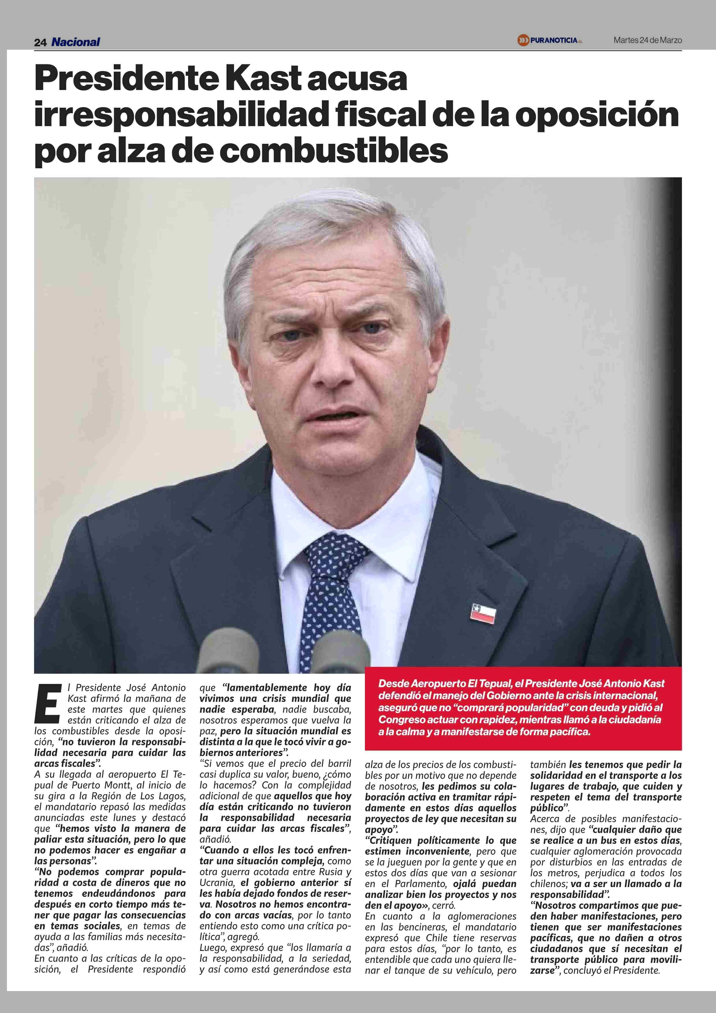Presidente Kast acusa irresponsabilidad fiscal de la oposición por alza de combustibles 24-03-2026 Puranoticia.cl |