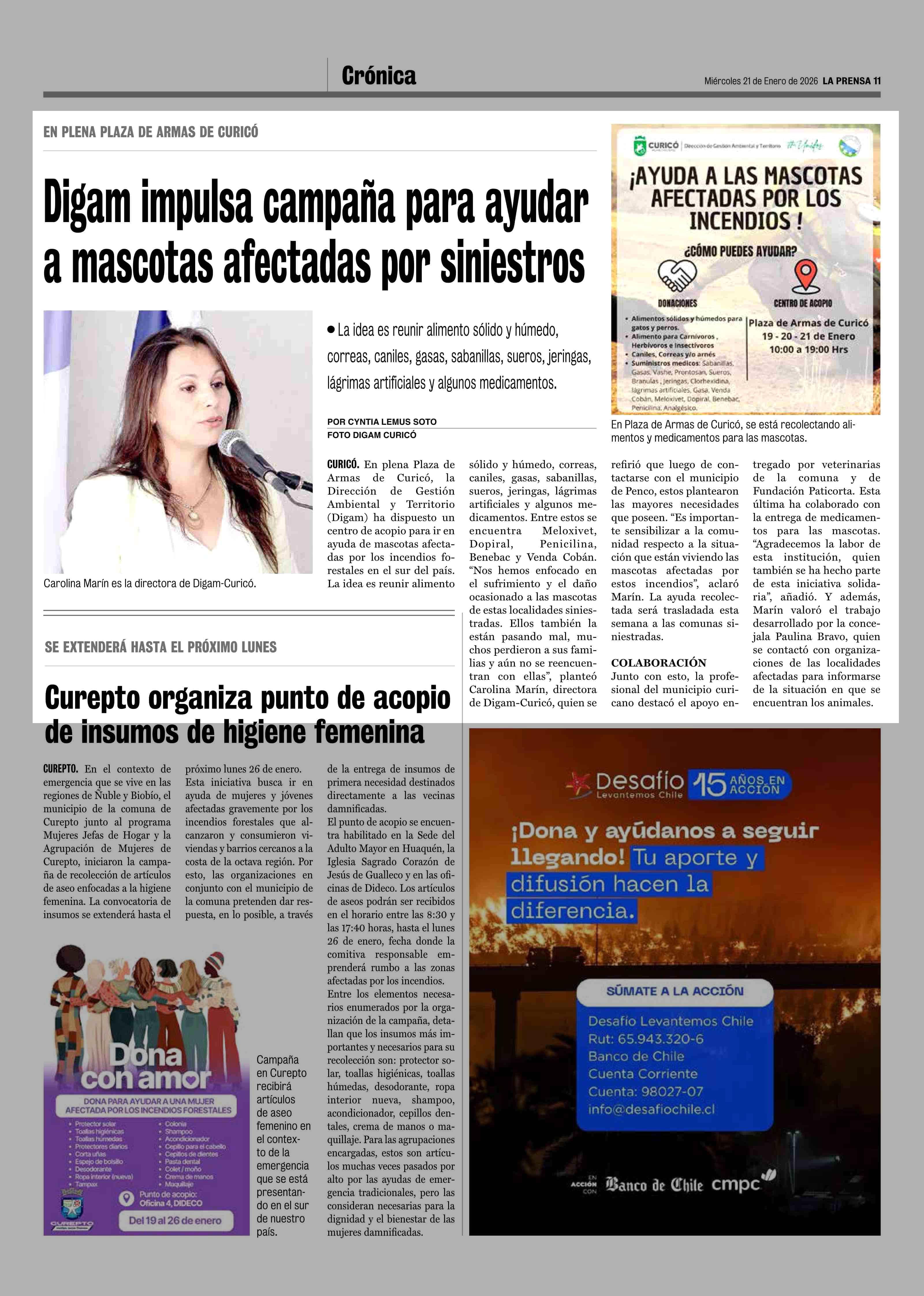Digam impulsa campaña para ayudar a mascotas afectadas por siniestros 21-01-2026 La Prensa de Curicó |