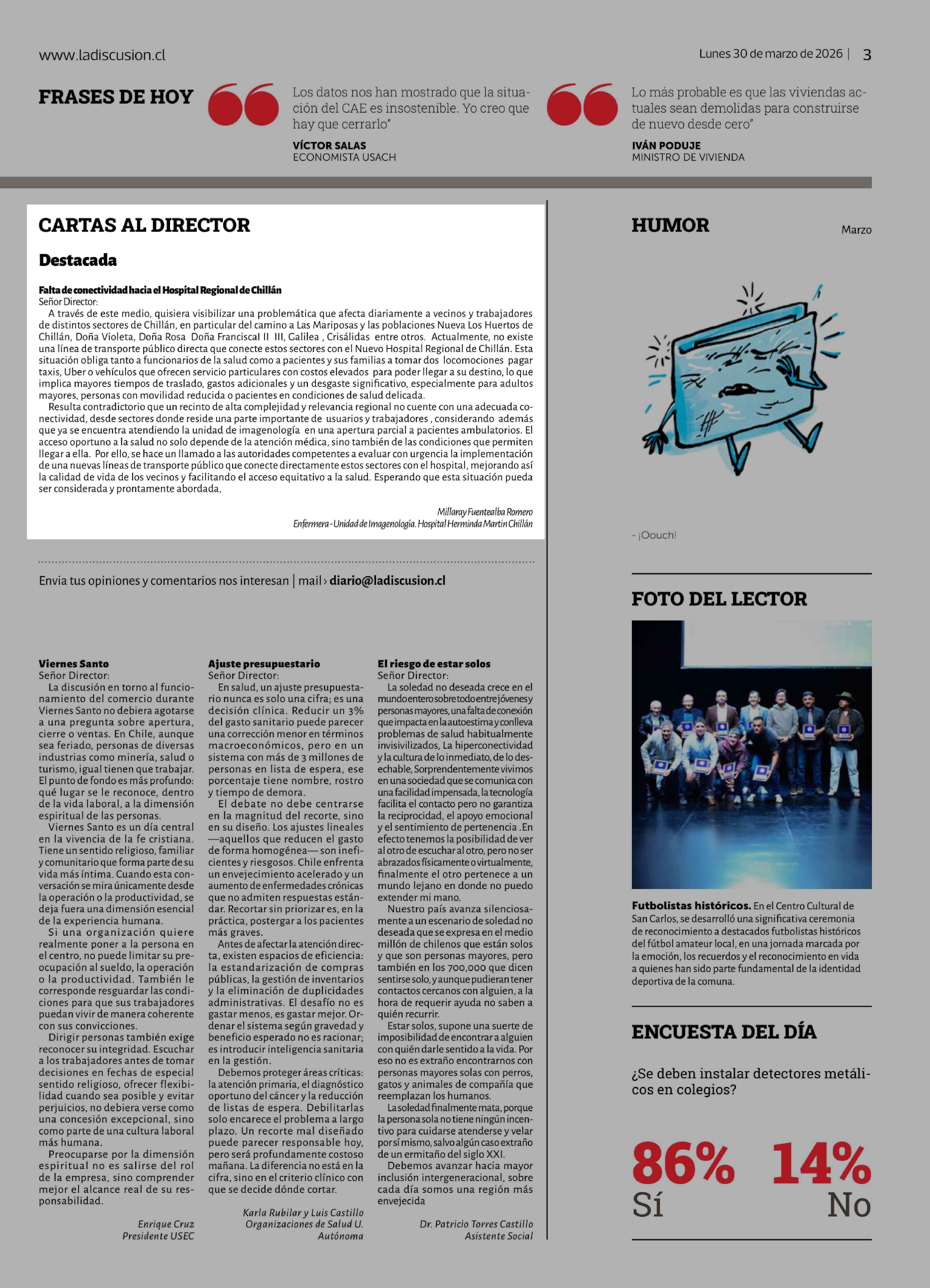 | Título: | Cartas: Falta de conectividad hacia el Hospital Regional de Chillan Señor Director: A través de este medio, quisiera visibilizar una problemática que afecta diariamente a vecinos y trabajadores de distintos sectores de Chillan, en particular del camino a Las Mariposas y las poblaciones Nueva Los Hue |