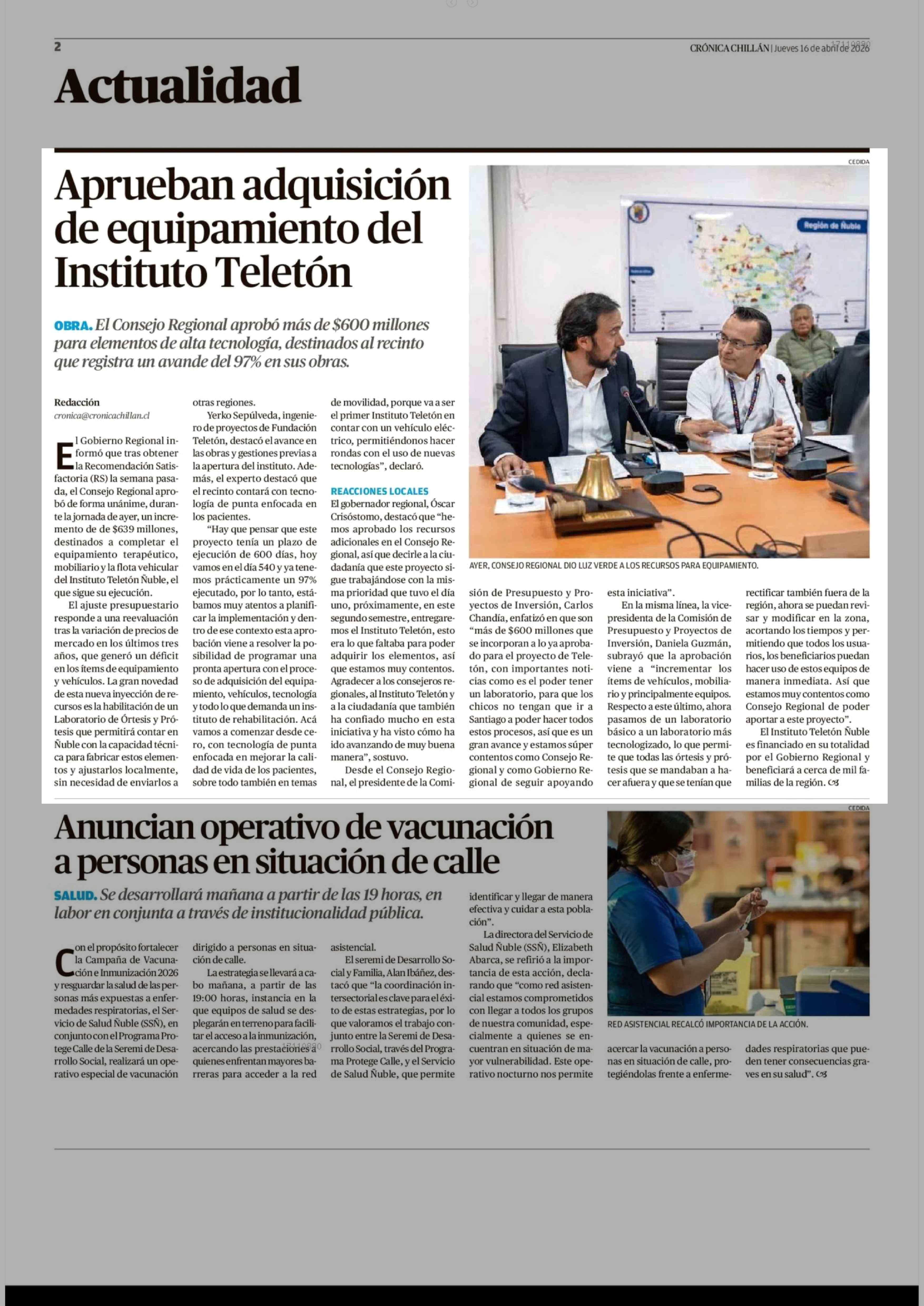 Aprueban adquisición de equipamiento del Instituto Teletón 16-04-2026 Crónica de Chillán |