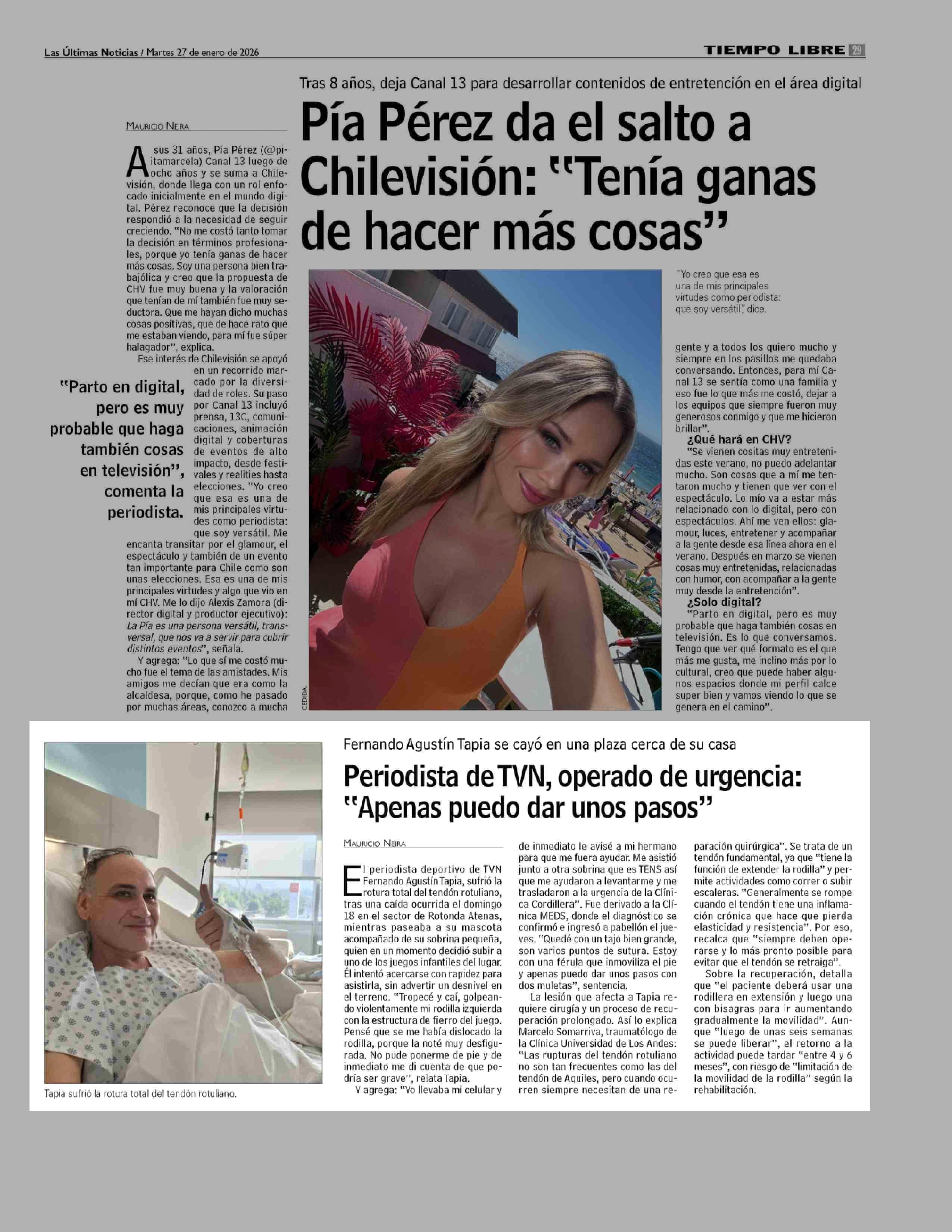Periodista de TVN, operado de urgencia: "Apenas puedo dar unos pasos" 27-01-2026 Las Últimas Noticias |