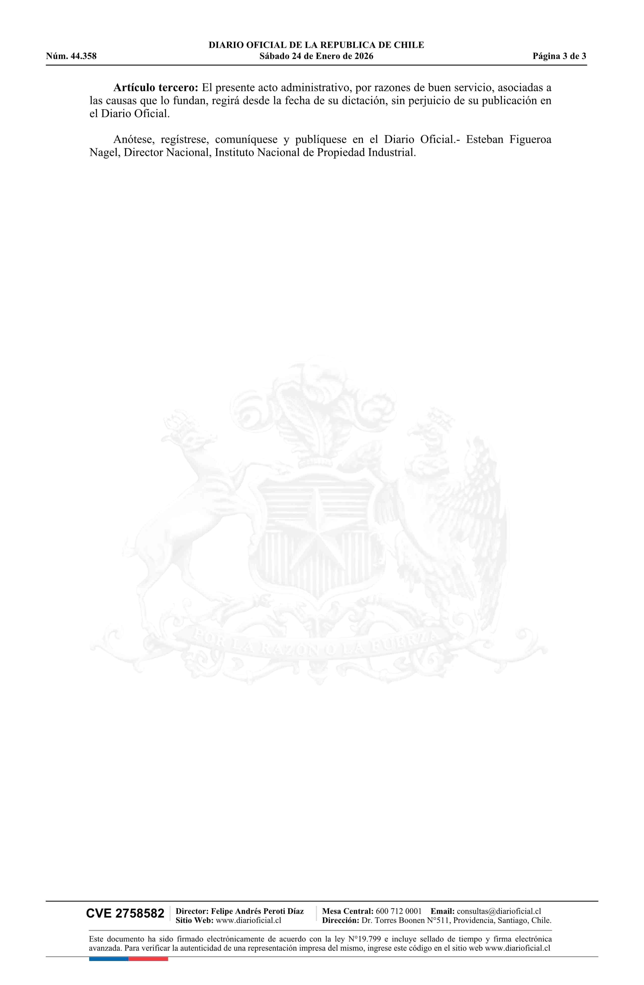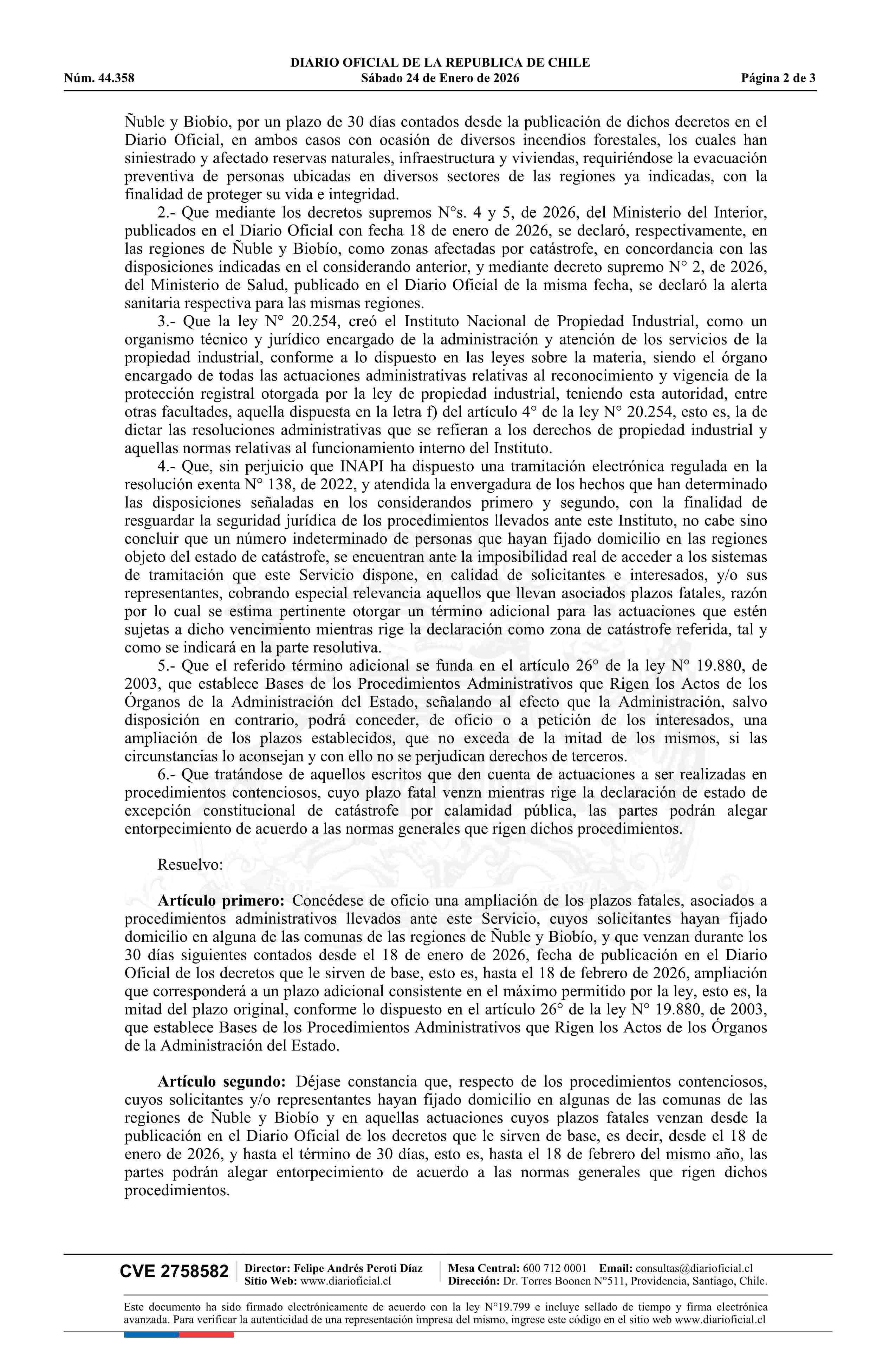 | Título: | Resolución exenta número 19, de 2026.- Concede ampliación de oficio de plazos que indica, con ocasión de la declaración de estado de excepción constitucional de catástrofe de las regiones de Ñuble y Biobío, por período que indica |