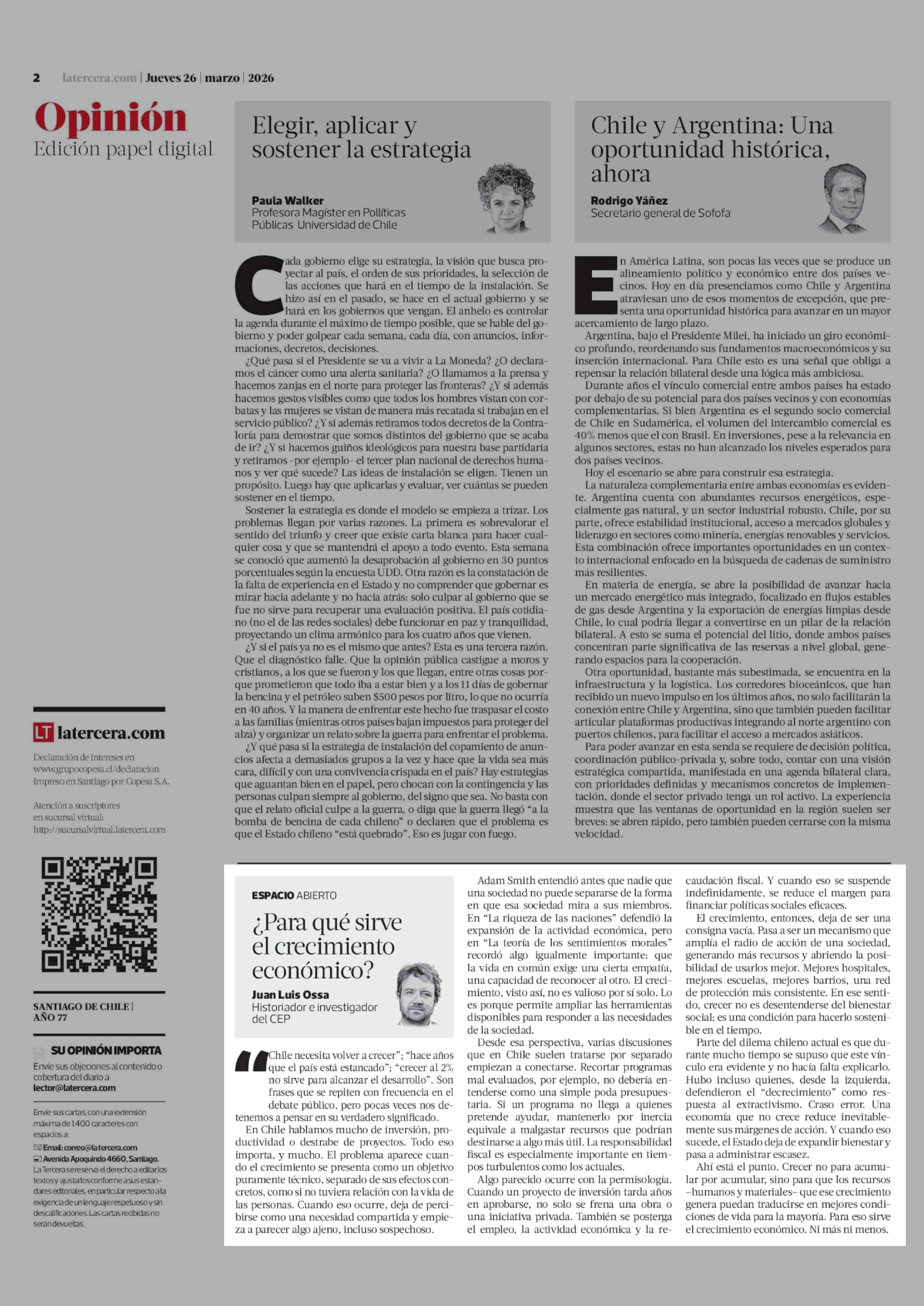 Columnas de Opinión: ¿Para qué sirve el crecimiento económico? 26-03-2026 La Tercera |