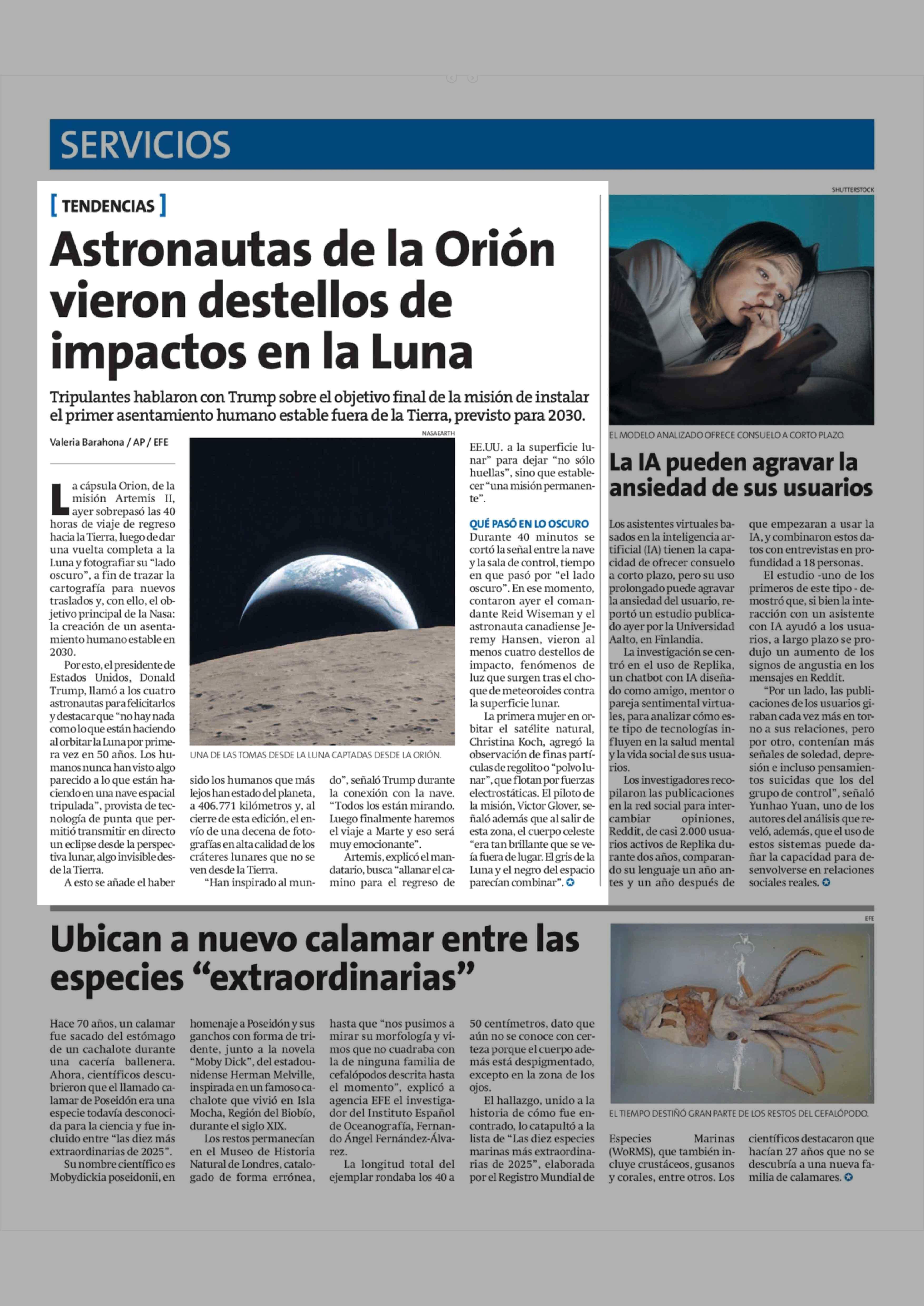 Astronautas de la Orión vieron destellos de impactos en la Luna 08-04-2026 La Estrella de Antofagasta |
