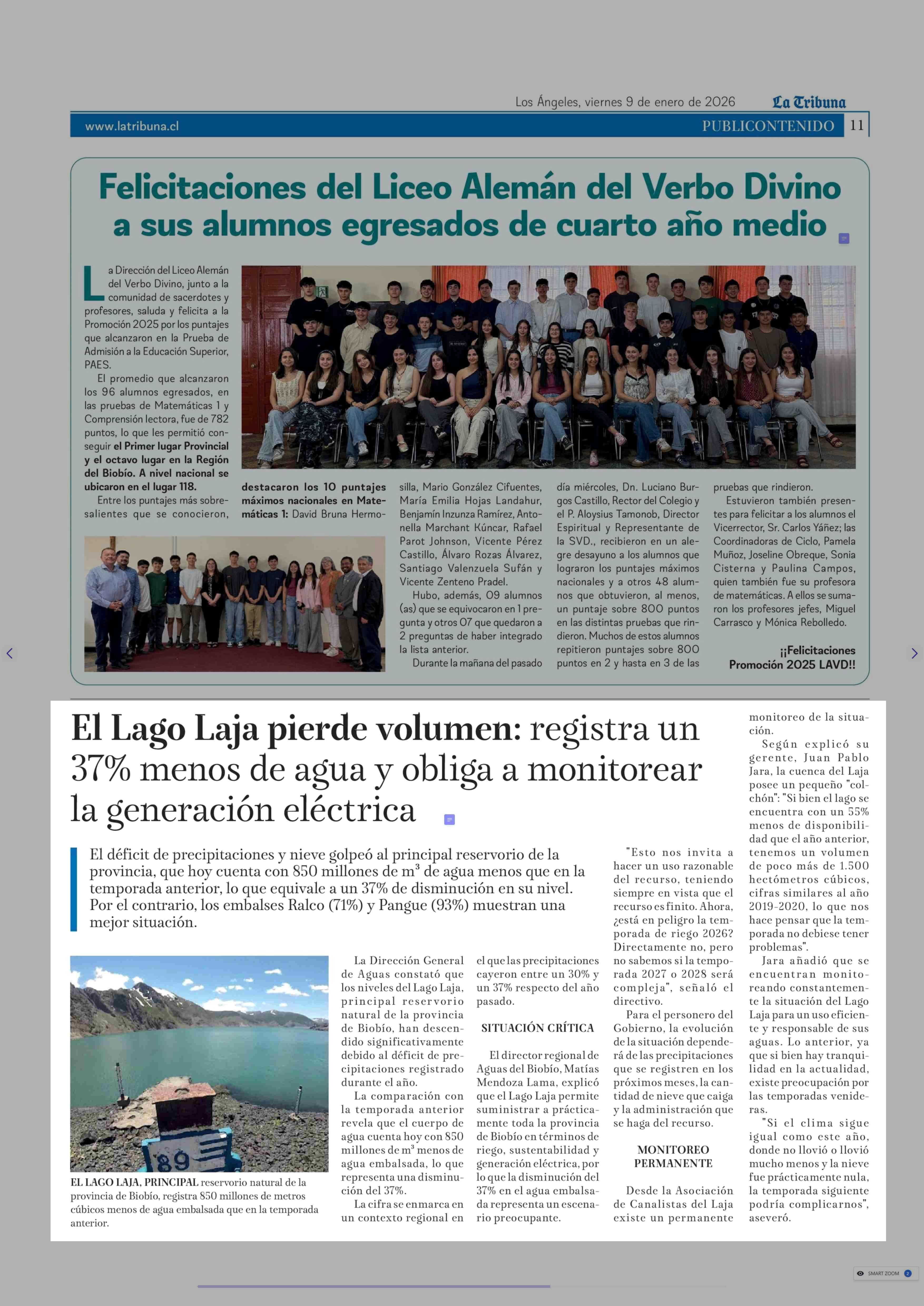 El Lago Laja pierde volumen: registra un 37% menos de agua y obliga a monitorear la generación eléctrica 09-01-2026 La Tribuna |