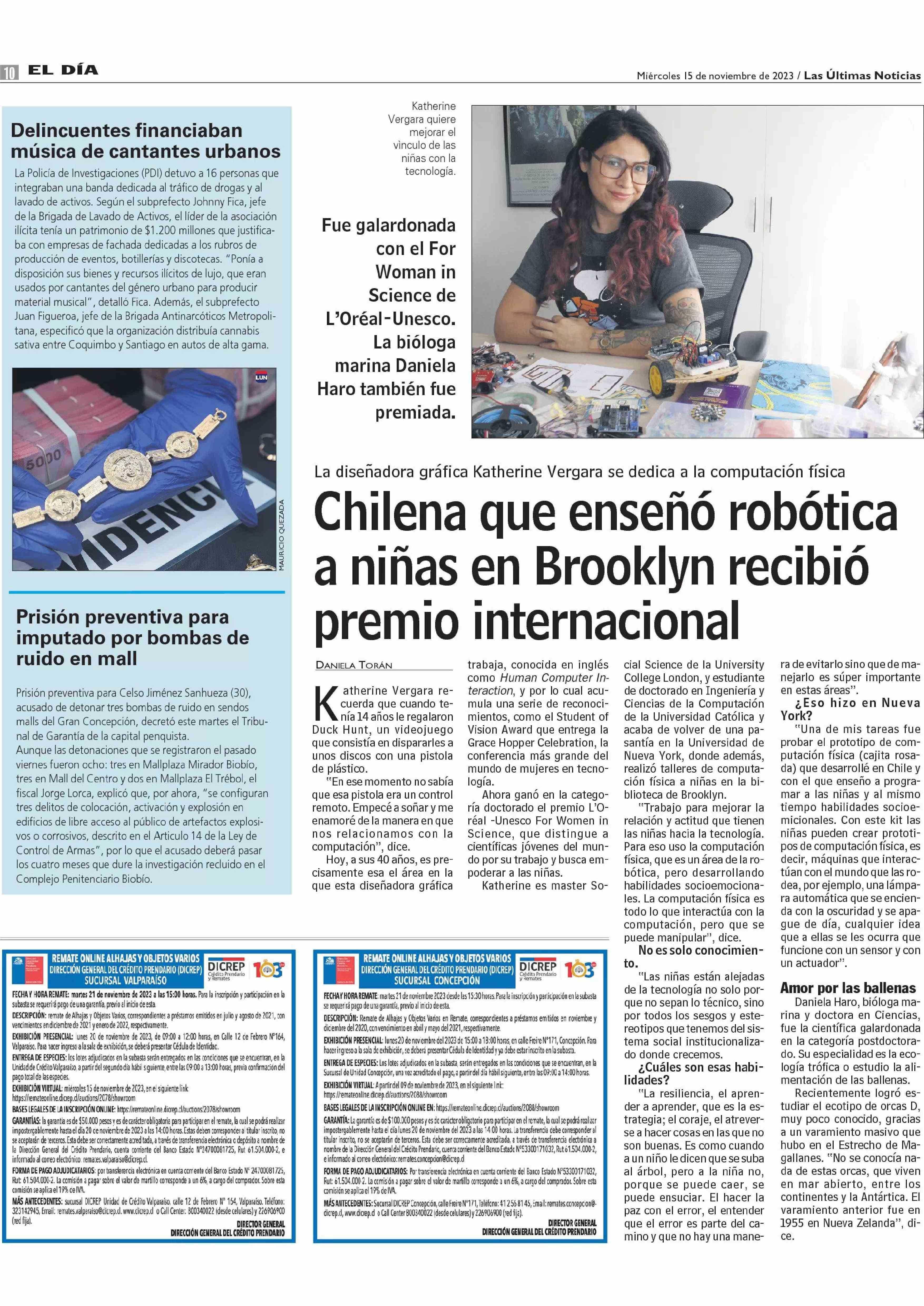 Chilena que enseñó robótica a niñas en Brooklyn recibió premio internacional 15-11-2023 Las Últimas Noticias |