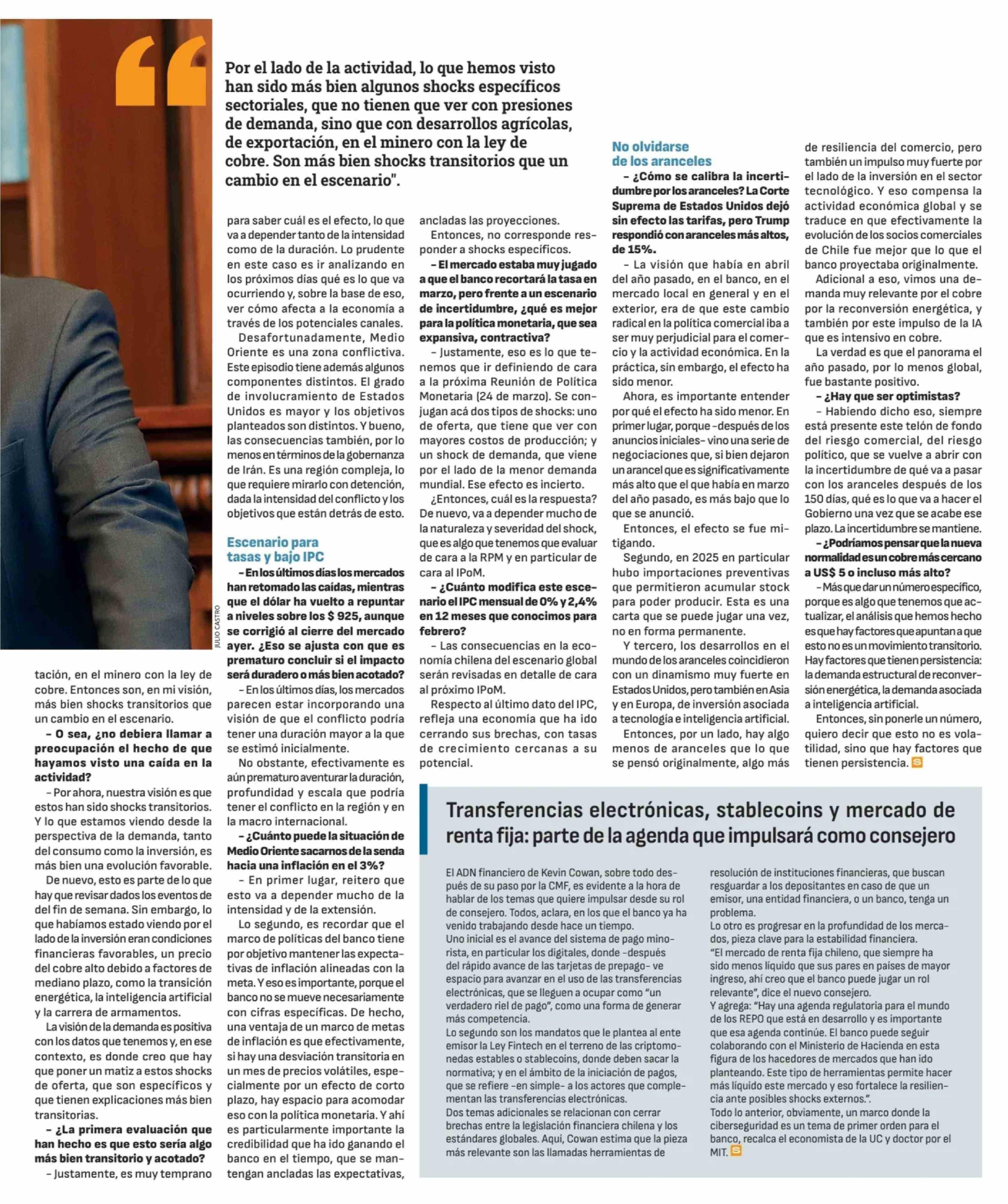 | Título: | Kevin Cowan, consejero del Banco Central: "Los mercados parecen estar incorporando que el conflicto podría tener una duración mayor" |