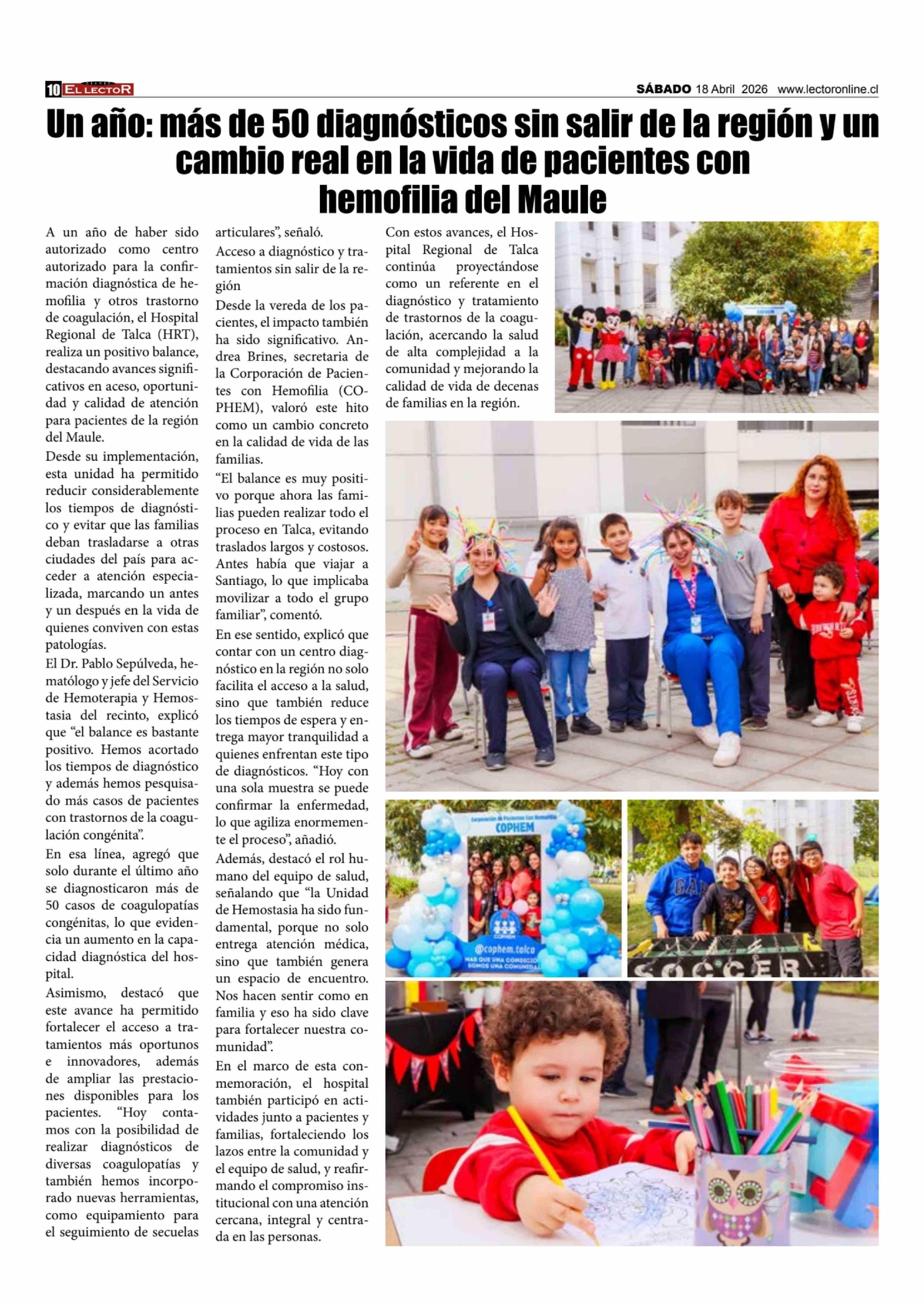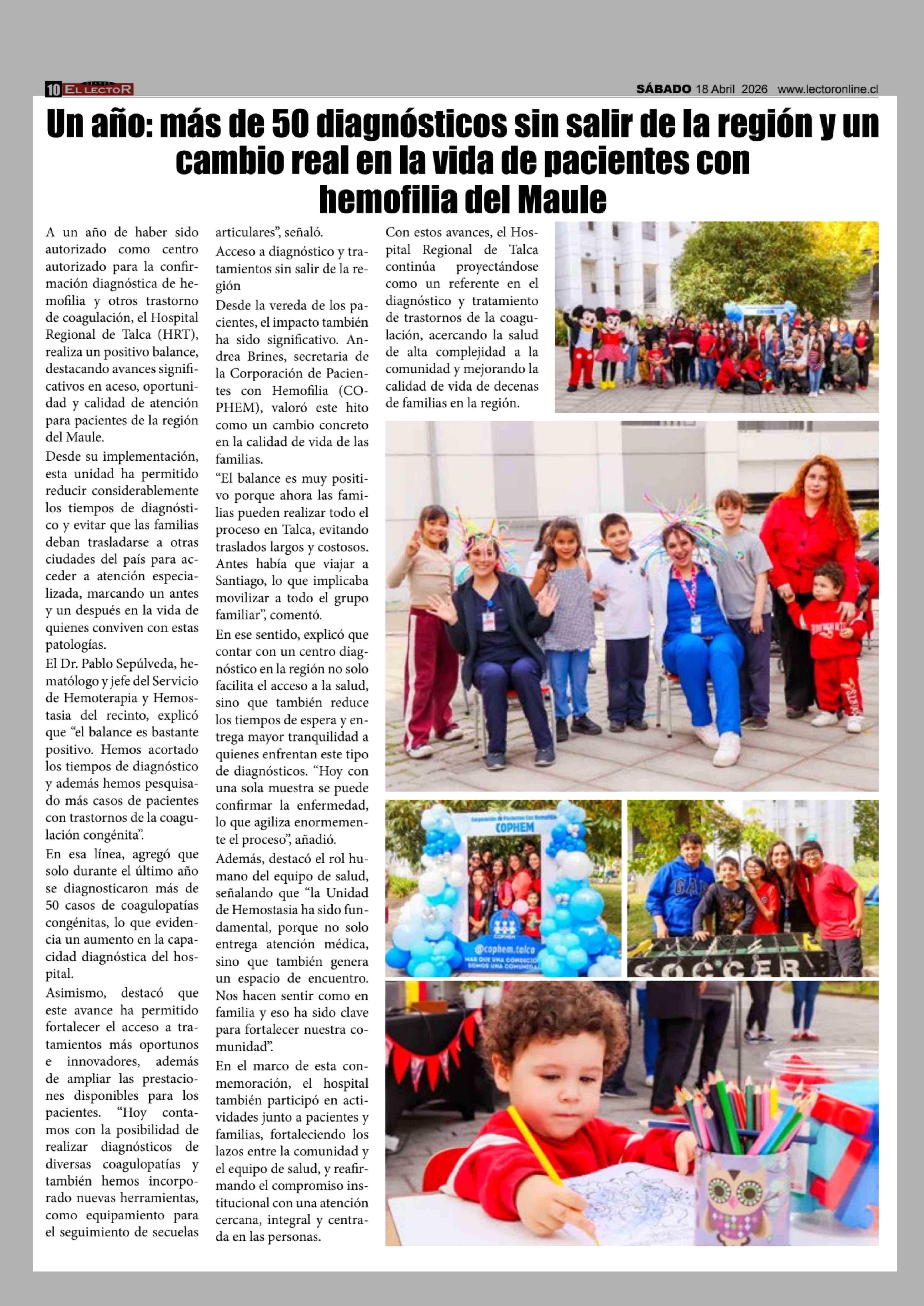 Un año: más de 50 diagnósticos sin salir de la región y un cambio real en la vida de pacientes con hemofilia del Maule 18-04-2026 El Lector |