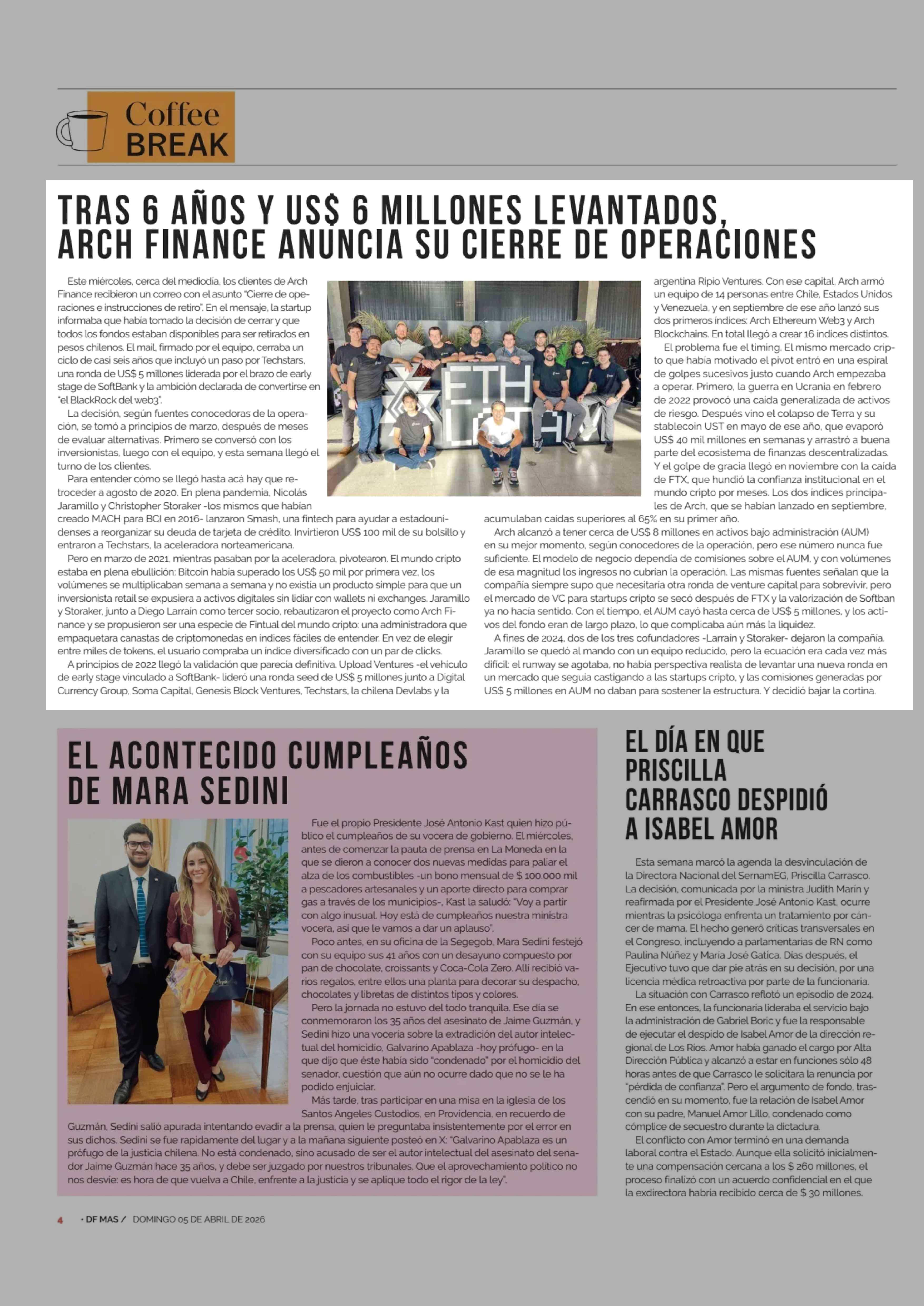 TRAS 6 AÑOS Y US$ 6 MILLONES LEVANTADOS ARCH FINANCE ANUNCIA SU CIERRE DE OPERACIONES 05-04-2026 Diario Financiero |