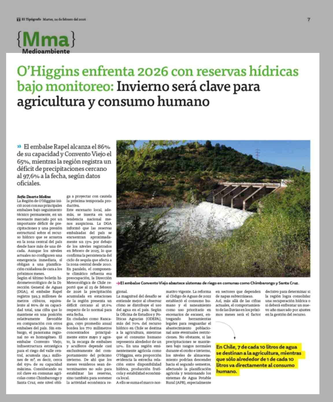 O'Higgins enfrenta 2026 con reservas hídricas bajo monitoreo: Invierno será clave para agricultura y consumo humano 24-02-2026 El Tipógrafo |