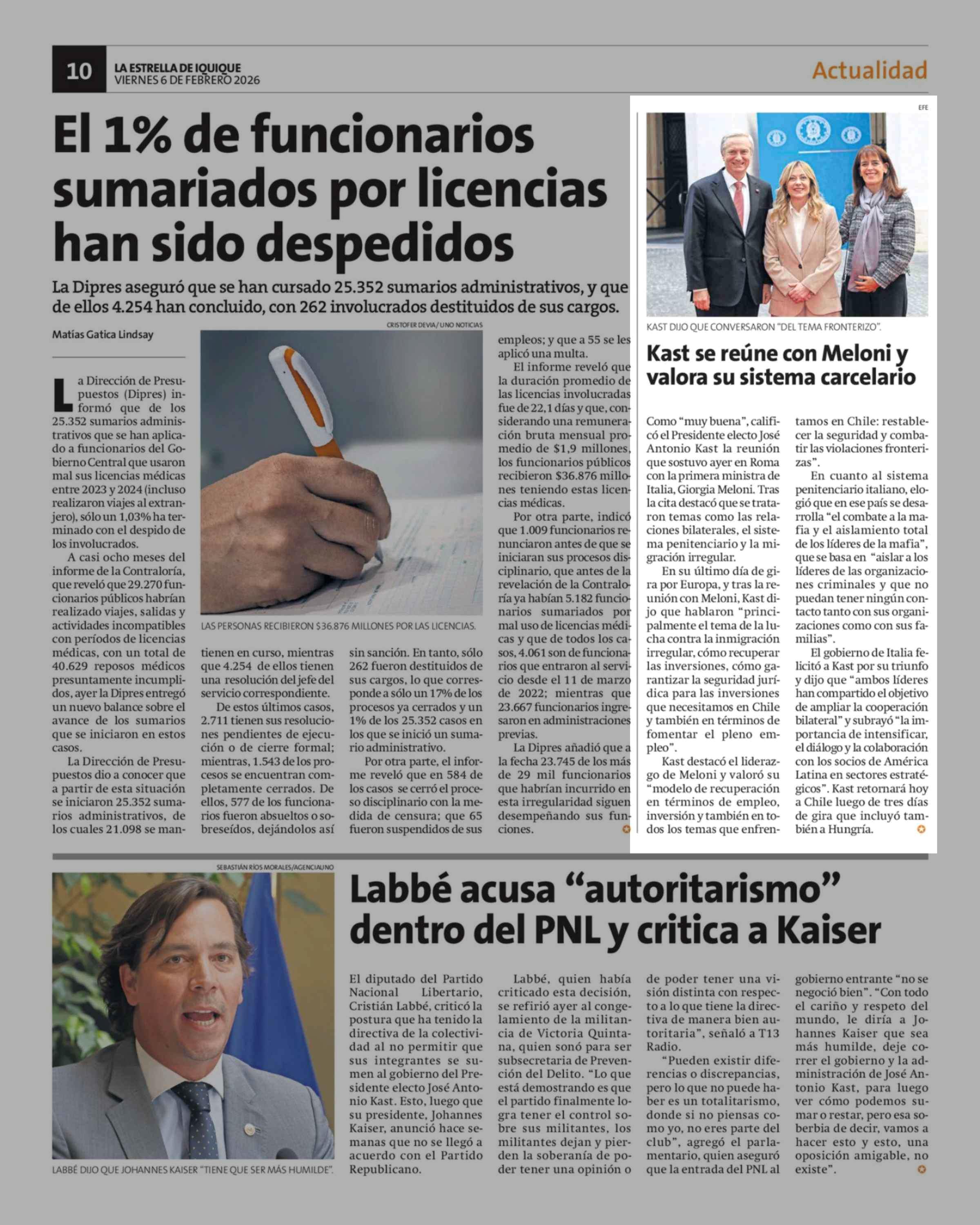 Kast se reúne con Meloni y valora su sistema carcelario 06-02-2026 La Estrella de Iquique |