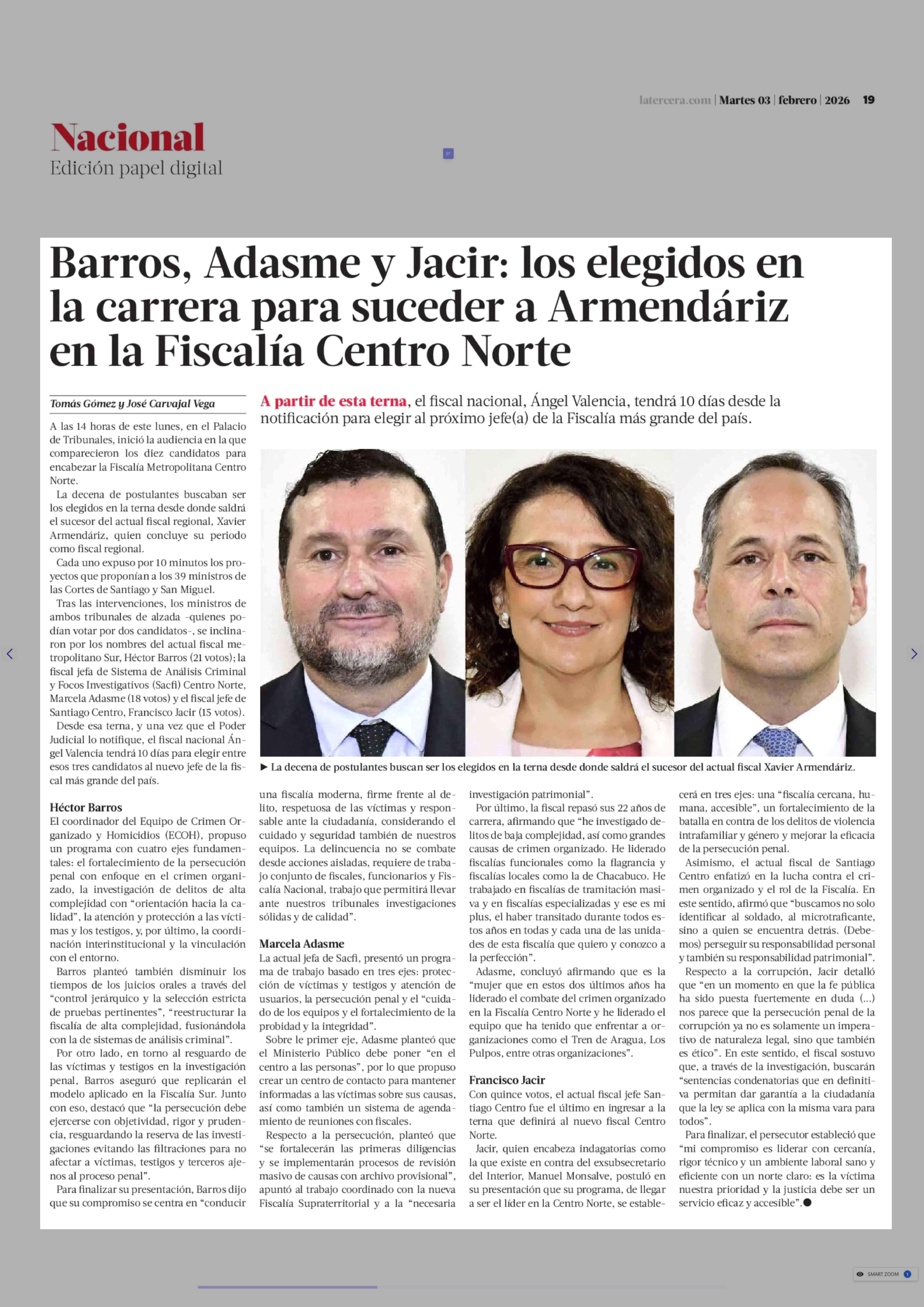 Barros, Adasme y Jacir: los elegidos en la carrera para suceder a Armendáriz en la Fiscalía Centro Norte 03-02-2026 La Tercera |