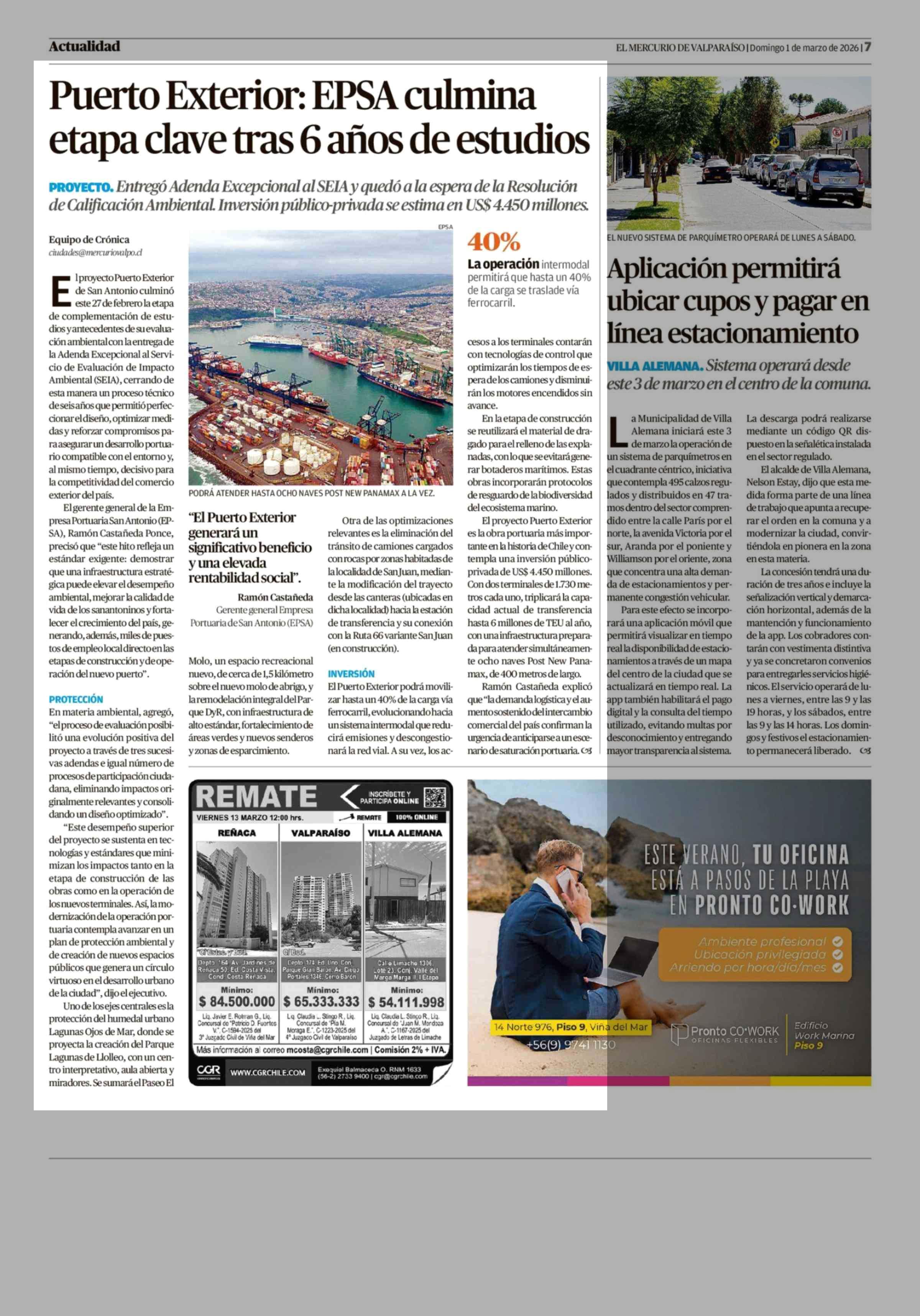 Puerto Exterior: EPSA culmina etapa clave tras 6 años de estudios 01-03-2026 El Mercurio de Valparaíso |