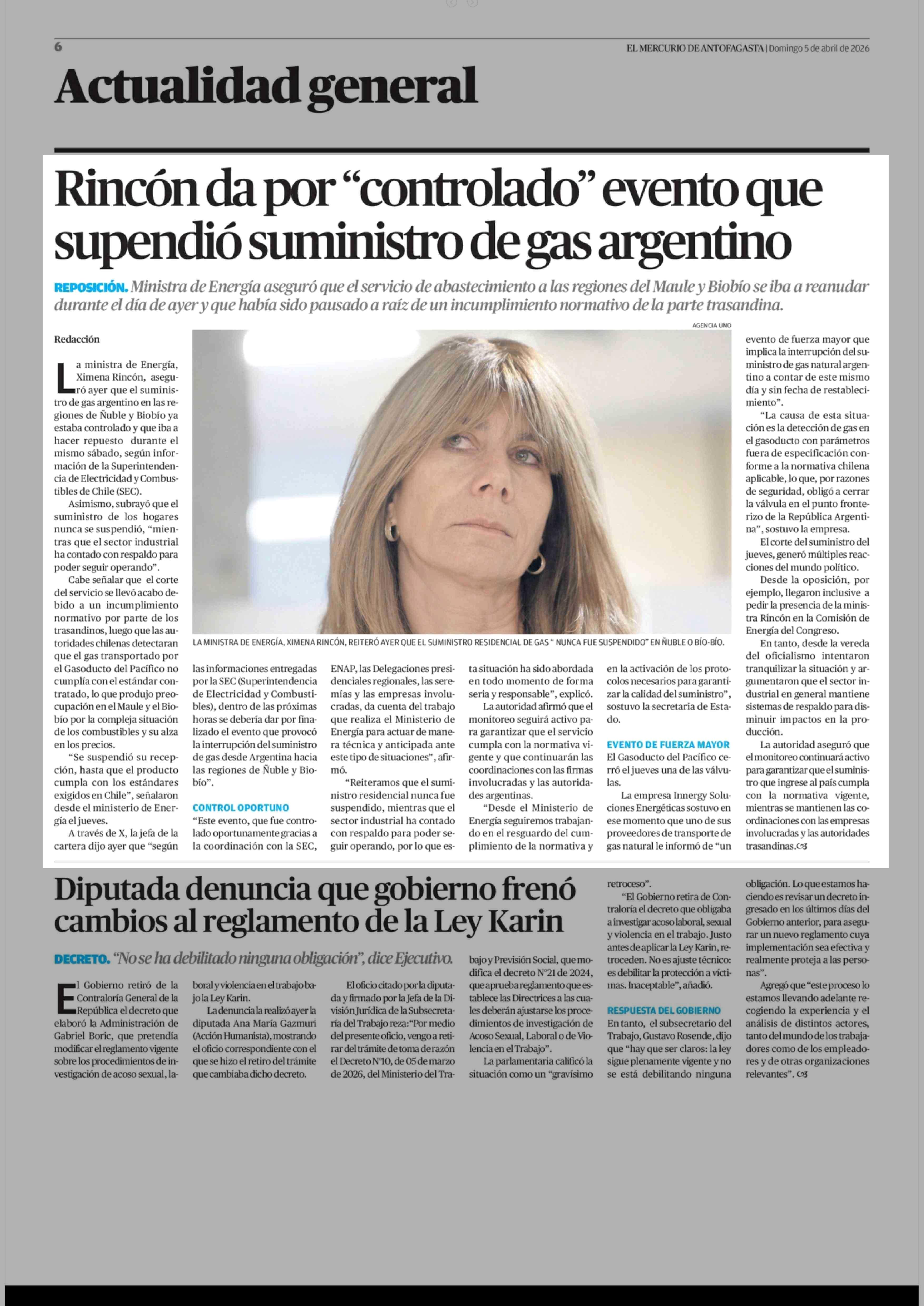 Rincón da por "controlado" evento que supendió suministro de gas argentino 05-04-2026 El Mercurio de Antofagasta |