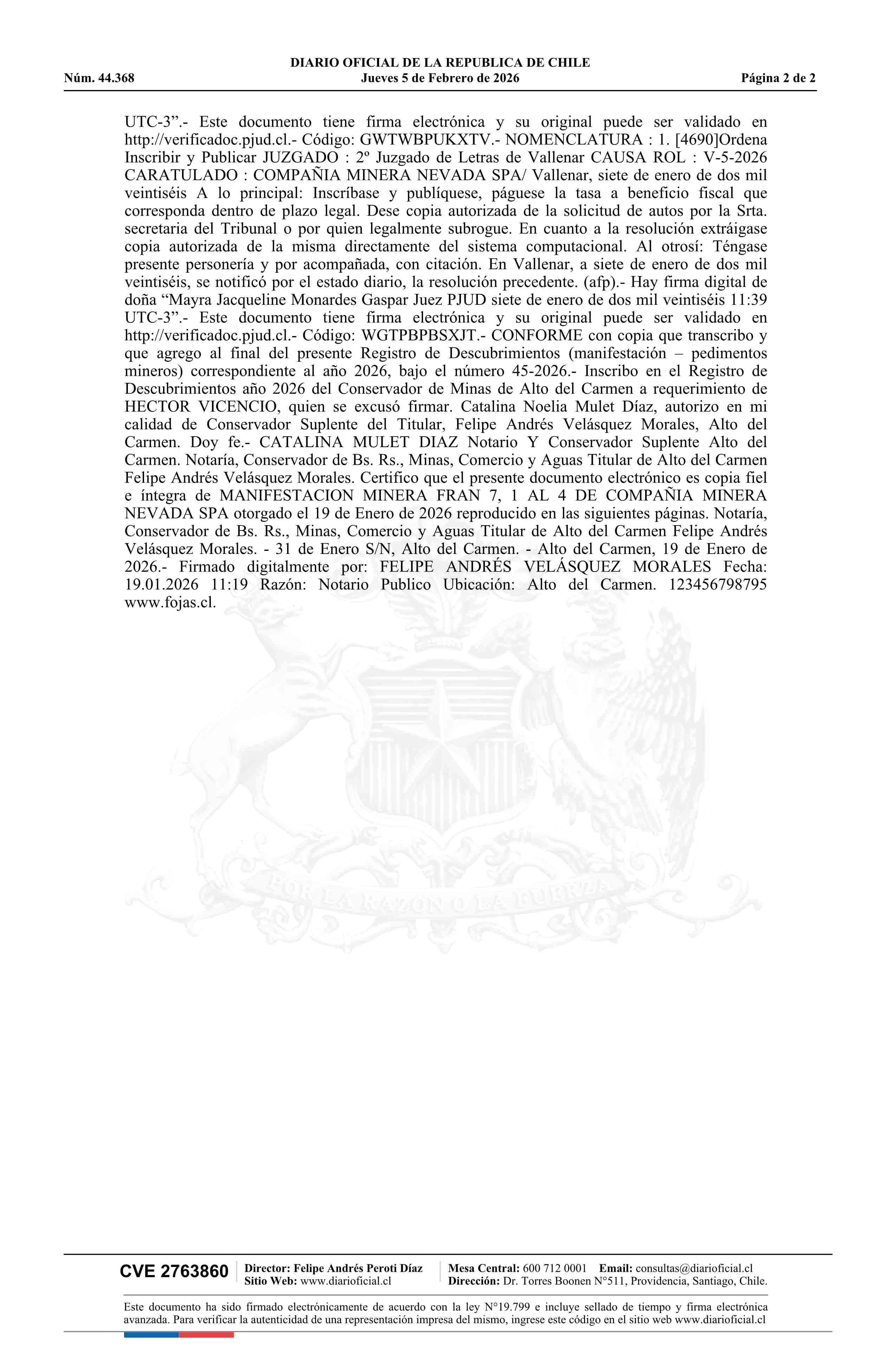 FRAN 7, 1 AL 4 / Compañía Minera Nevada SpA 05-02-2026 DIARIO OFICIAL CHILE - BOLETÍN OFICIAL DE MINERÍA |