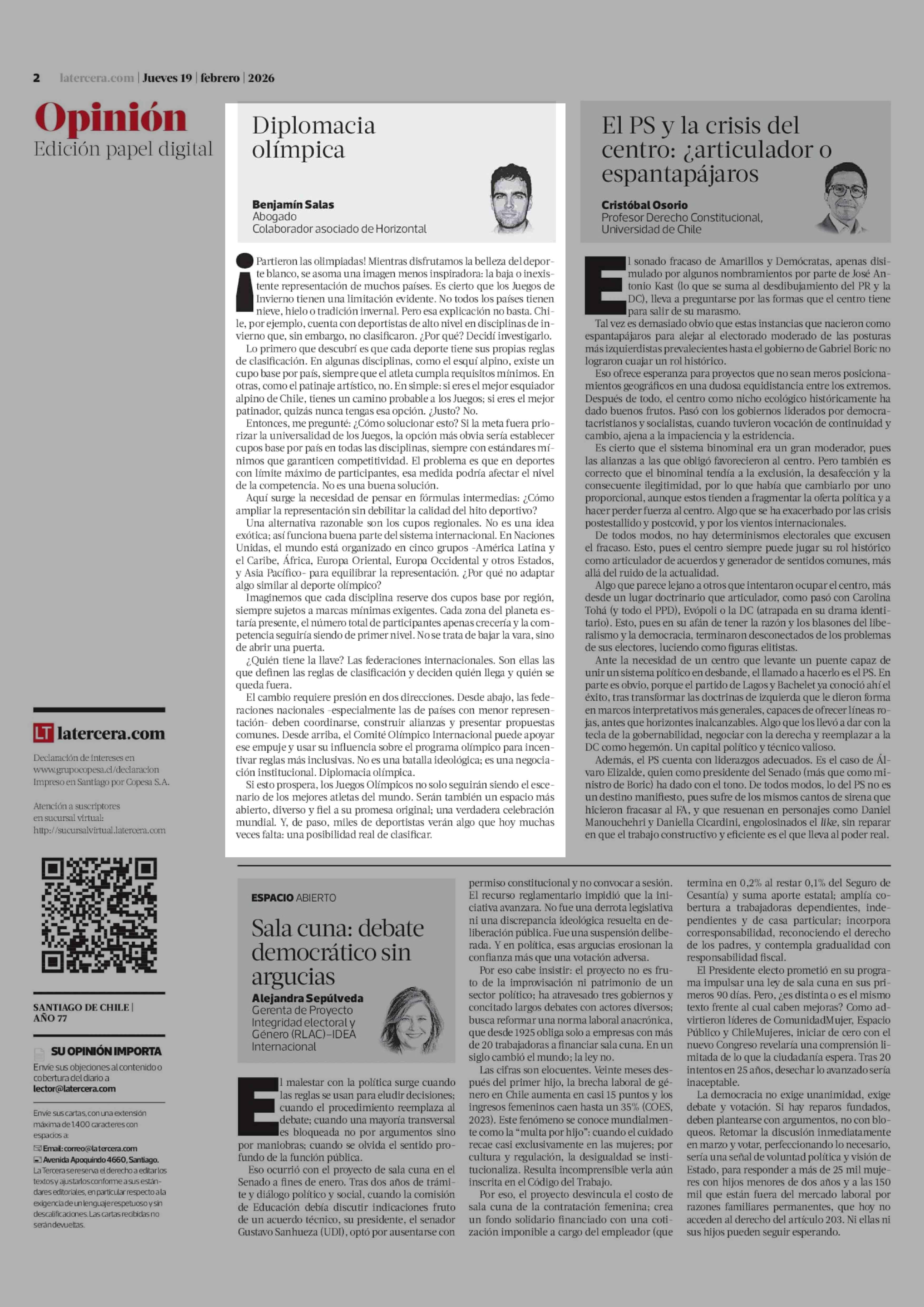 Columnas de Opinión: Diplomacia olímpica 19-02-2026 La Tercera |