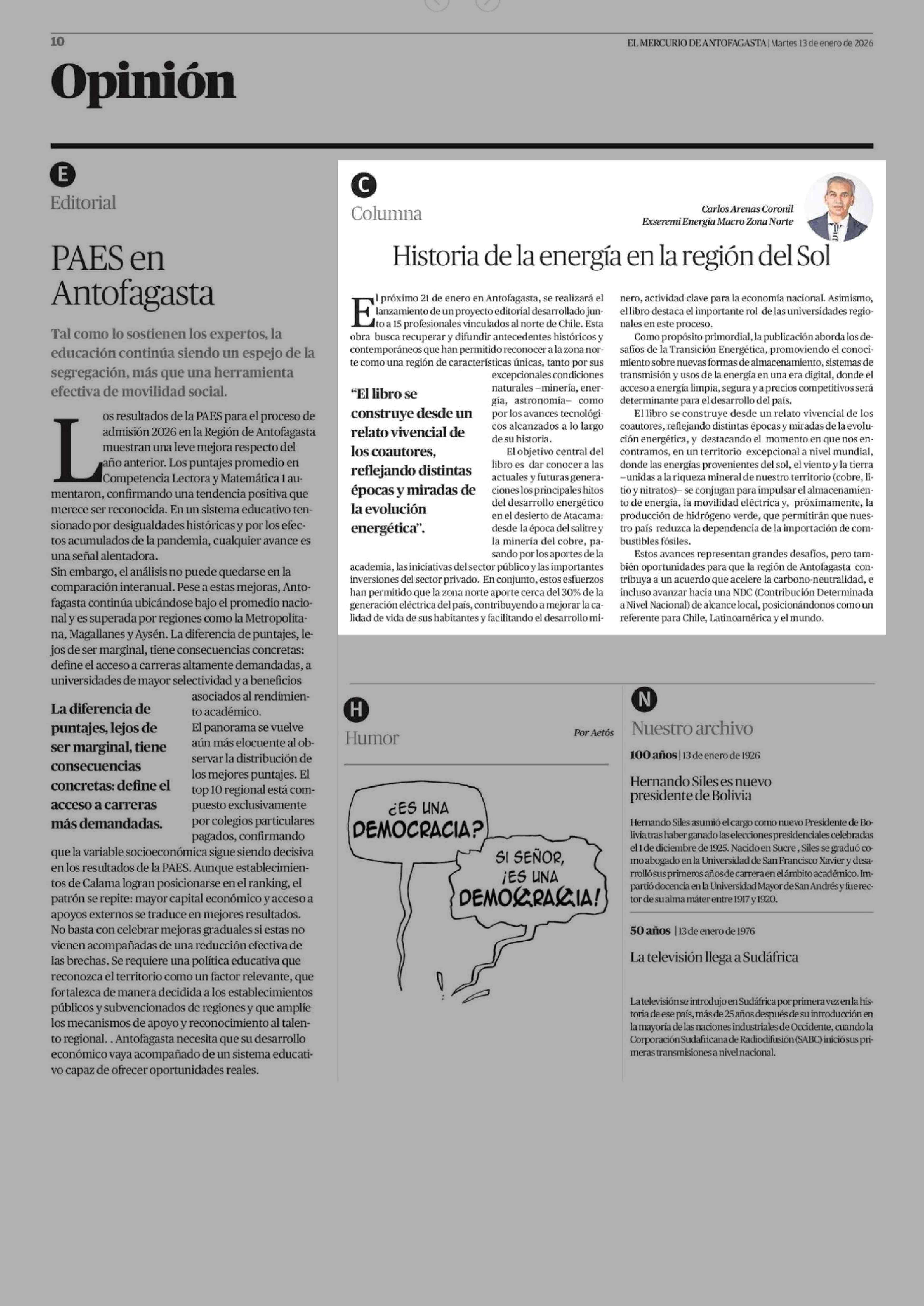 Columnas de Opinión: Historia de la energía en la región del Sol 13-01-2026 El Mercurio de Antofagasta |