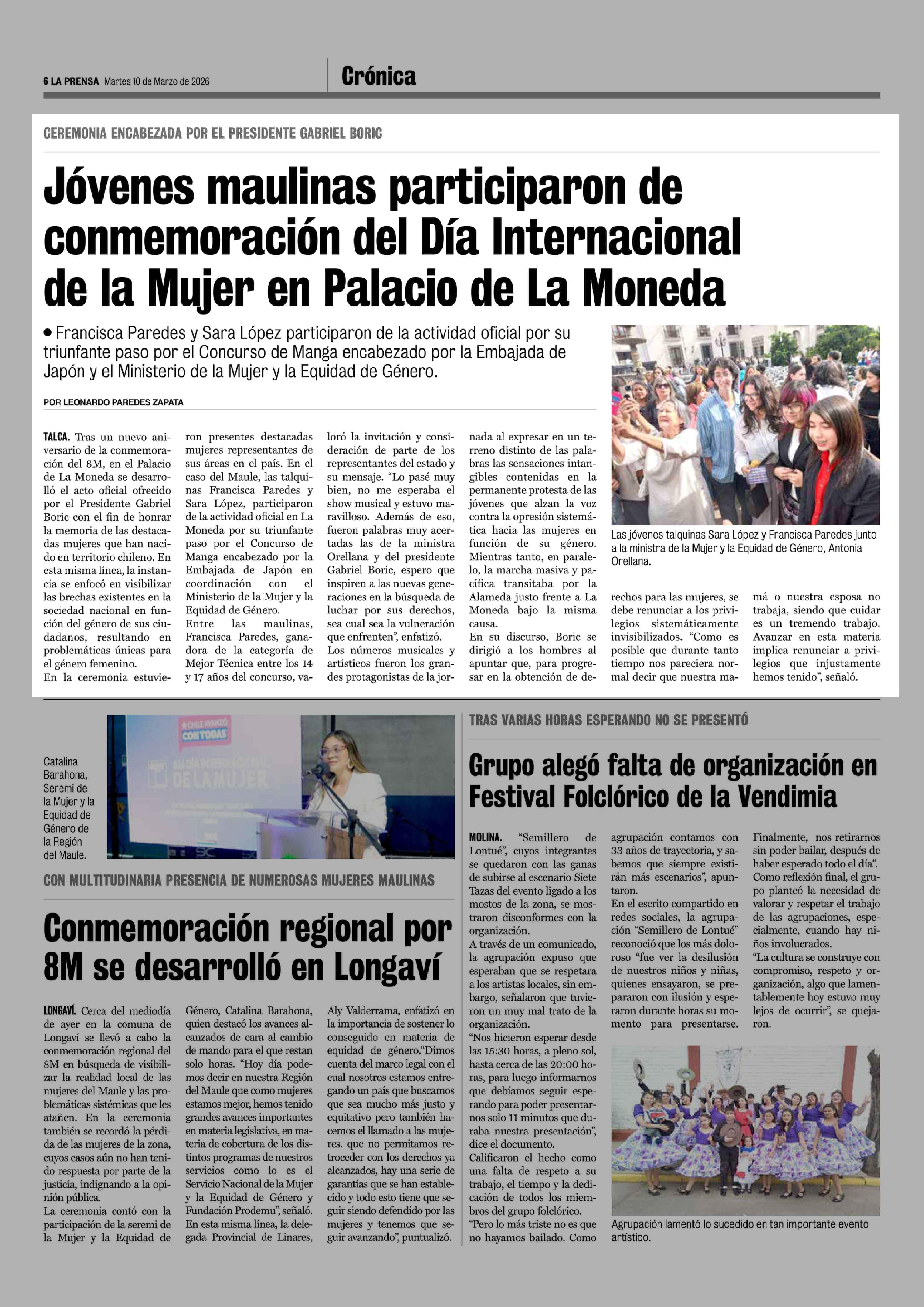 Jóvenes maulinas participaron de conmemoración del Día Internacional de la Mujer en Palacio de La Moneda 10-03-2026 La Prensa de Curicó |