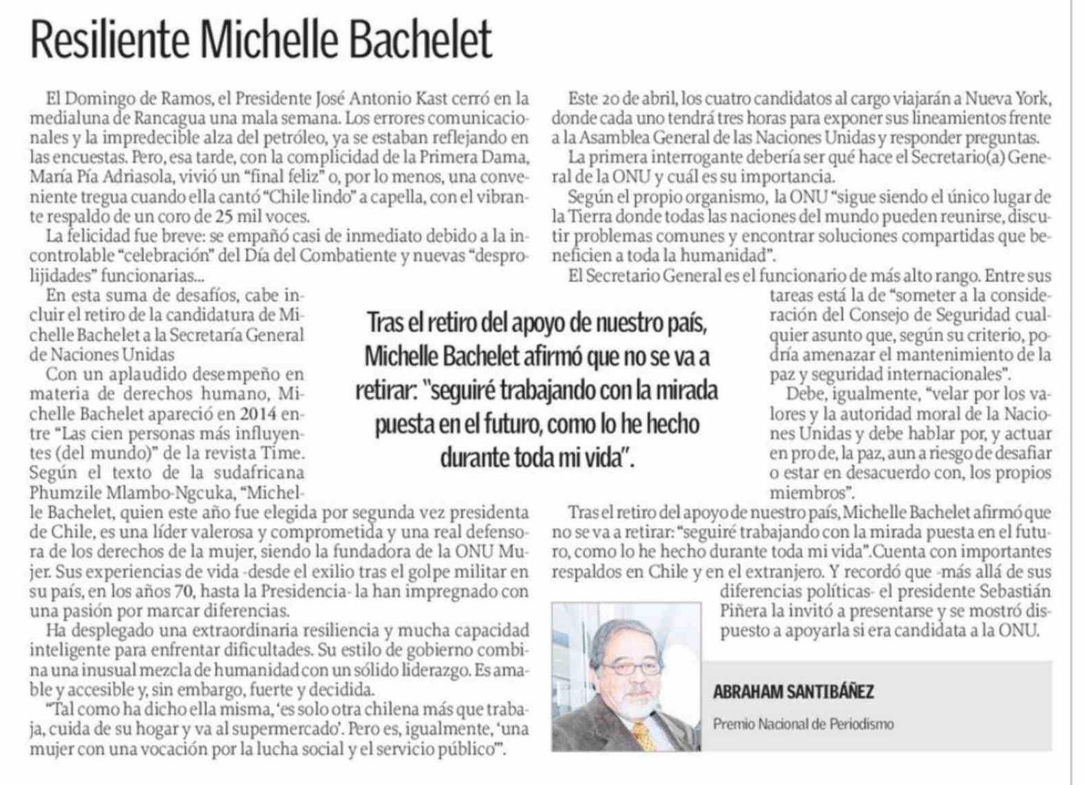Título: COLUMNAS DE OPINIÓN: Resiliente Michelle Bachelet