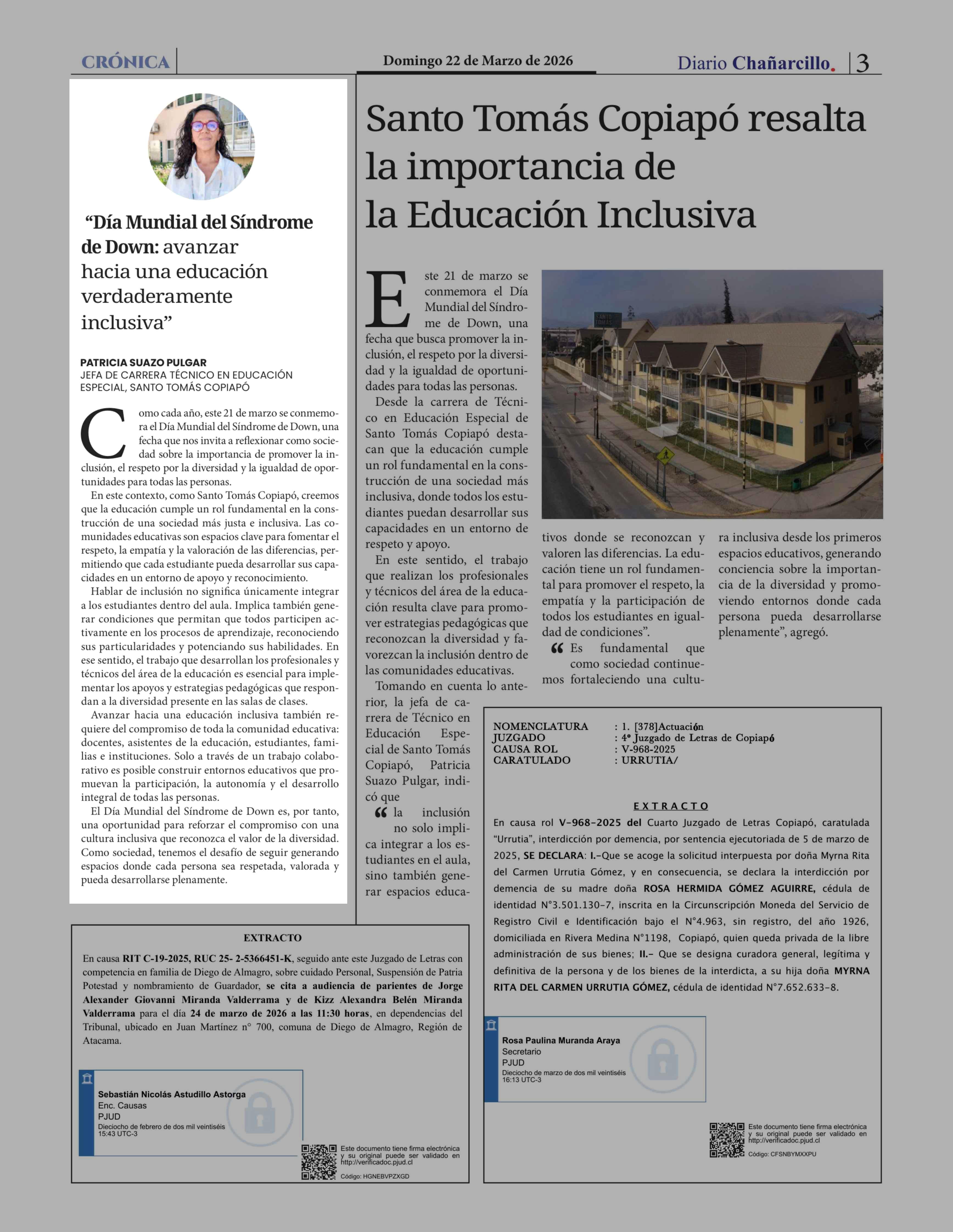 Columnas de Opinión: "Día Mundial del Síndrome de Down: avanzar hacia una educación verdaderamente inclusiva" 22-03-2026 Diario Chañarcillo |