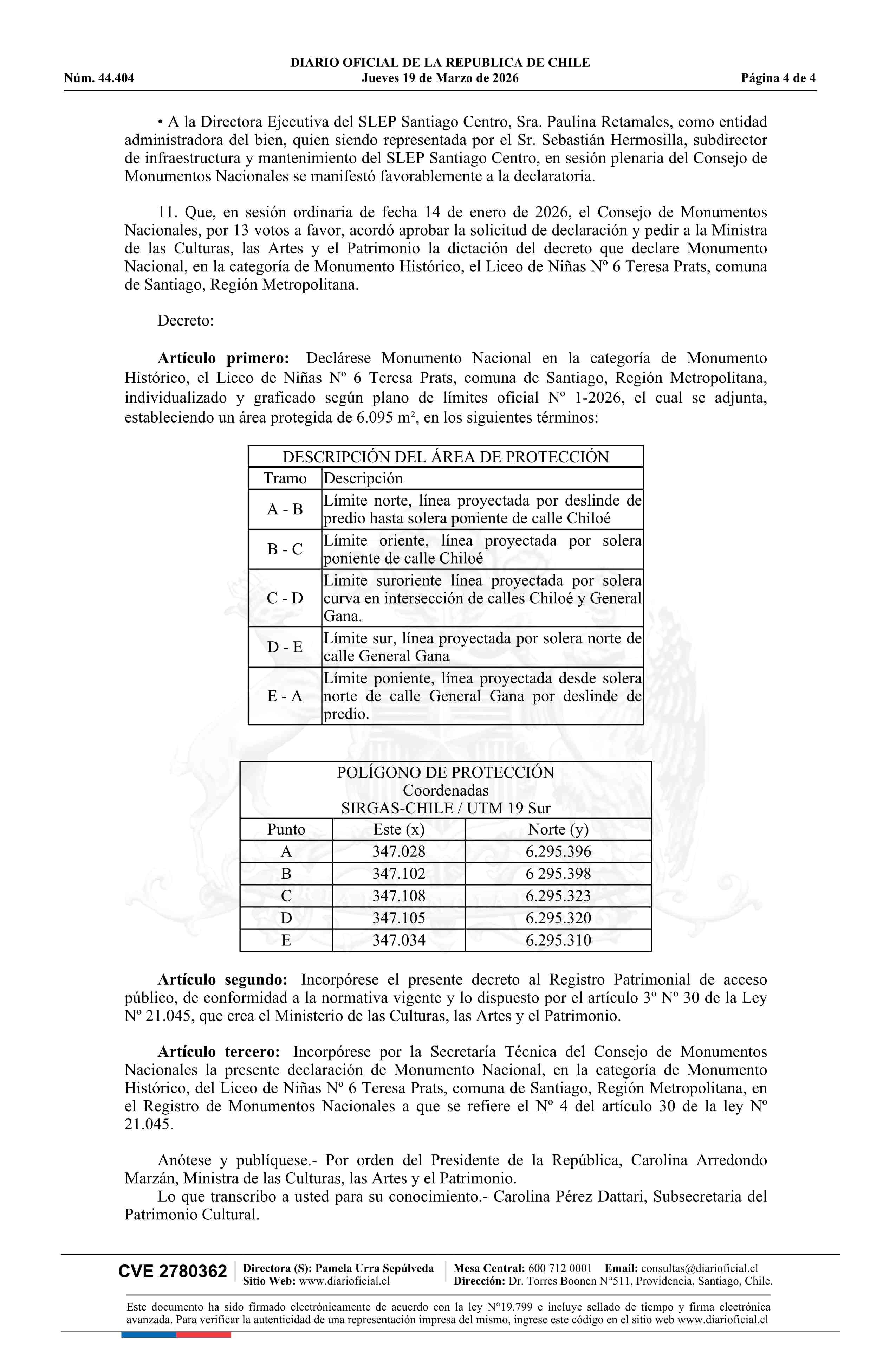 Decreto exento número 34, de 2026.- Declara Monumento Nacional, en la Categoría de Monumento Histórico, el Liceo de Niñas Nº 6, Teresa Prats, comuna de Santiago, Región Metropolitana de Santiago