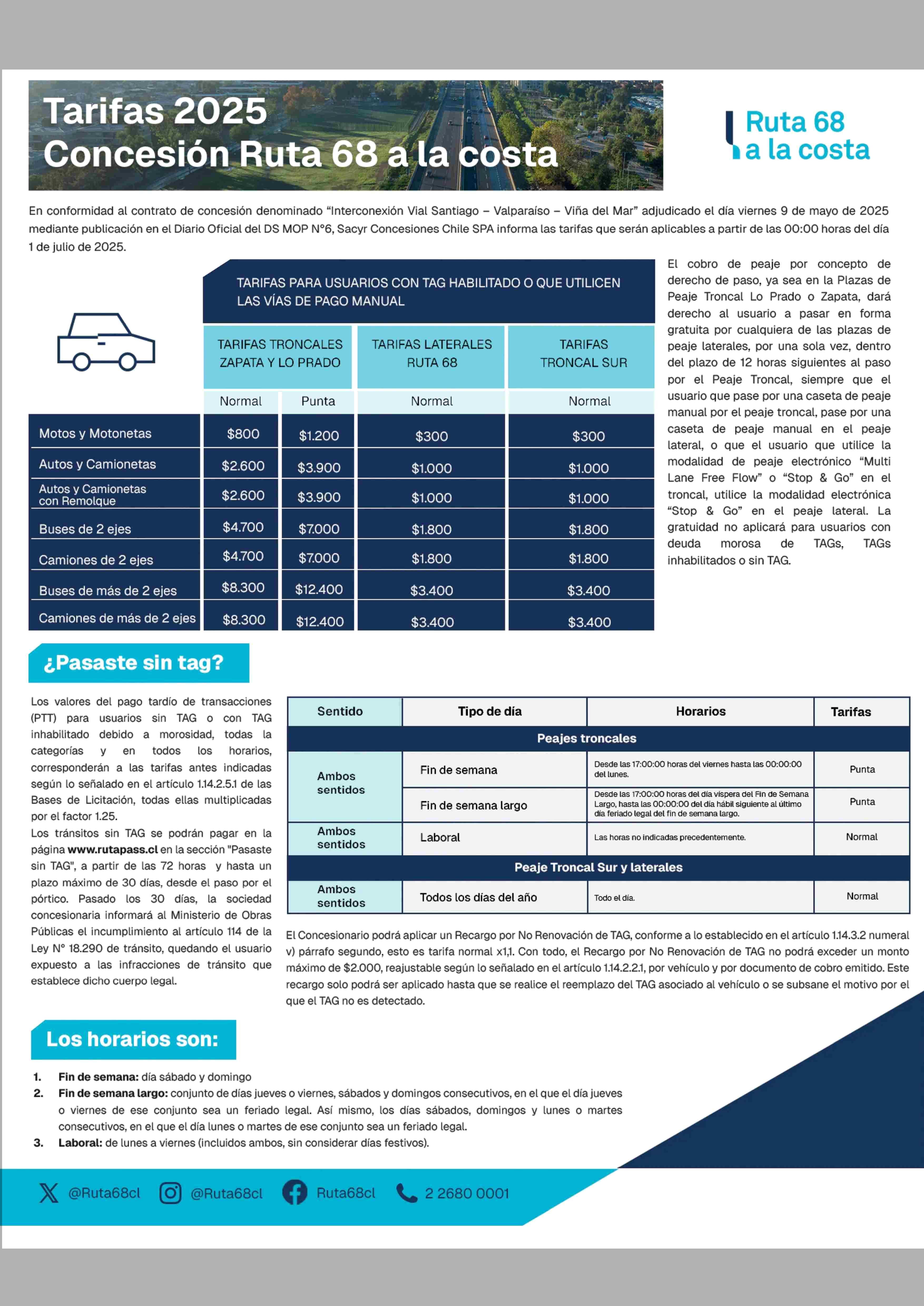 AVISO AUTOPISTAS: Tarifas 2025 Concesión Ruta 68 a la costa 14-06-2025 Las Últimas Noticias |