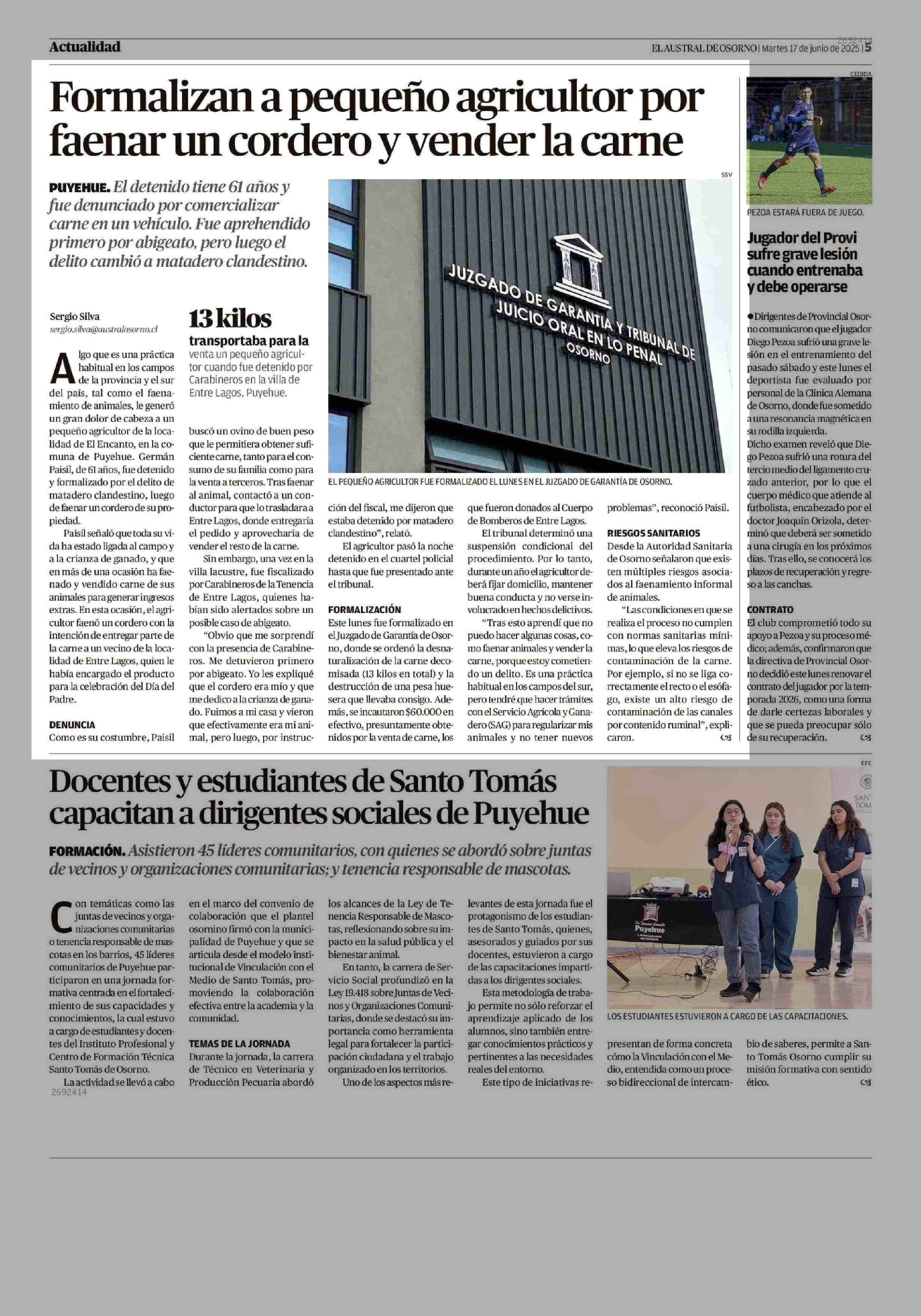 Formalizan a pequeño agricultor por faenar un cordero y vender la carne 17-06-2025 El Austral de Osorno |