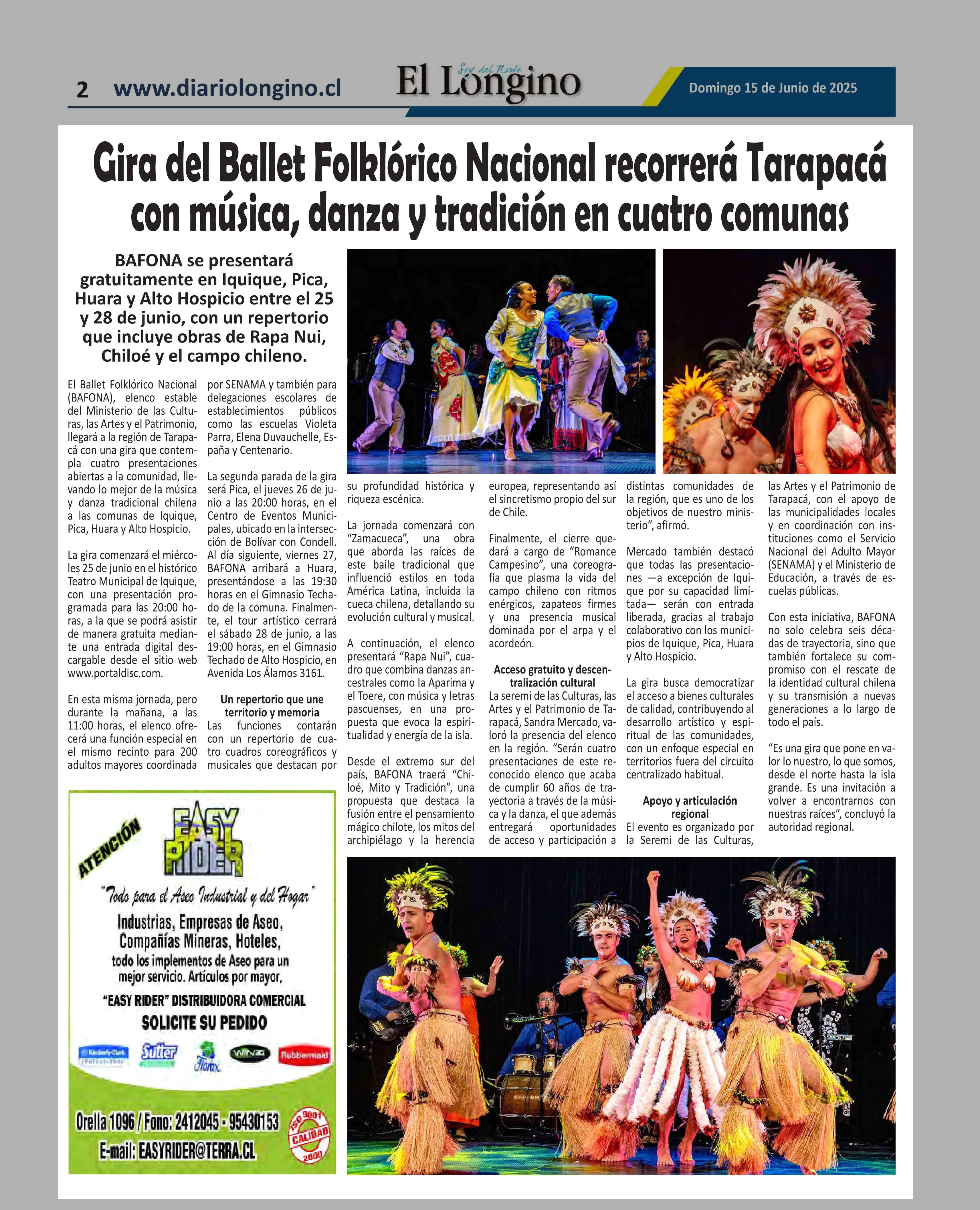 Gira del Ballet Folklórico Nacional recorrerá Tarapacá con música, danza y tradición en cuatro comunas 15-06-2025 El Longino |