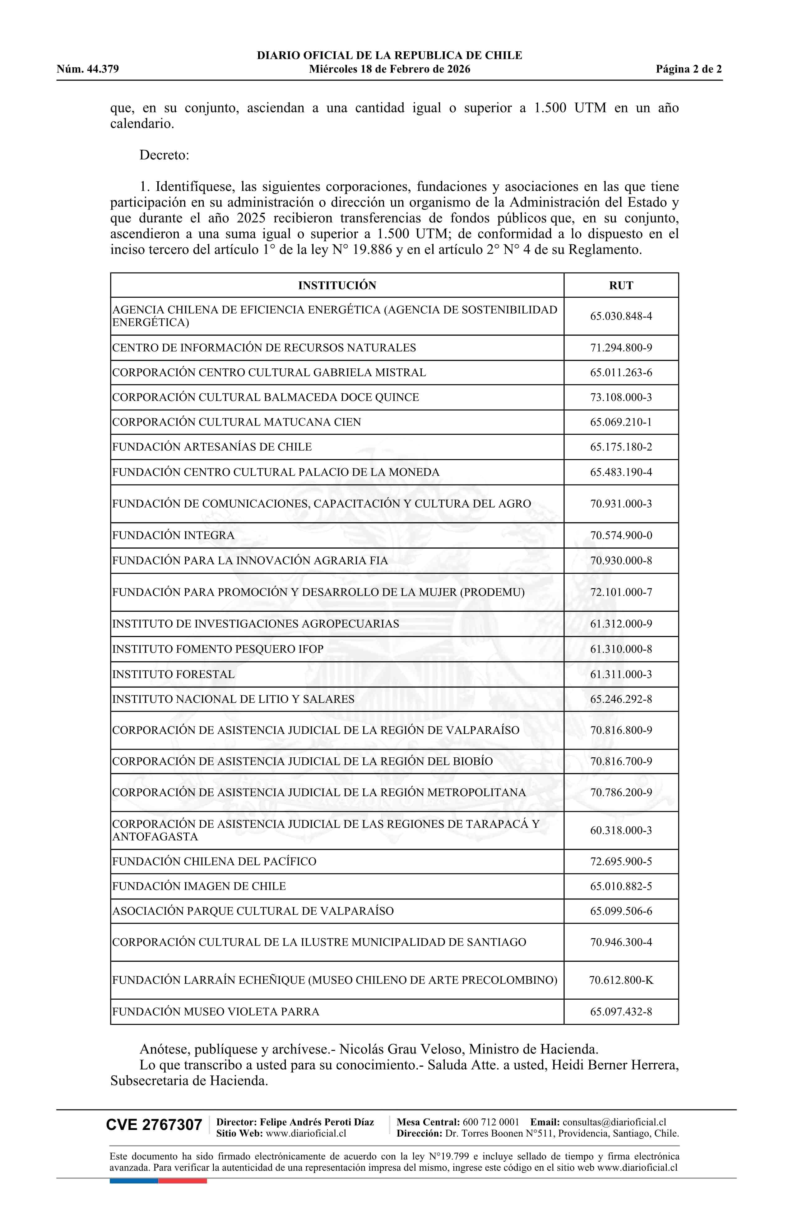 Decreto exento número 27, de 2026.- Identifica corporaciones, fundaciones y asociaciones del inciso tercero del artículo 1° de la ley N° 19.886 18-02-2026 DIARIO OFICIAL CHILE - BOLETÍN OFICIAL DE MINERÍA |