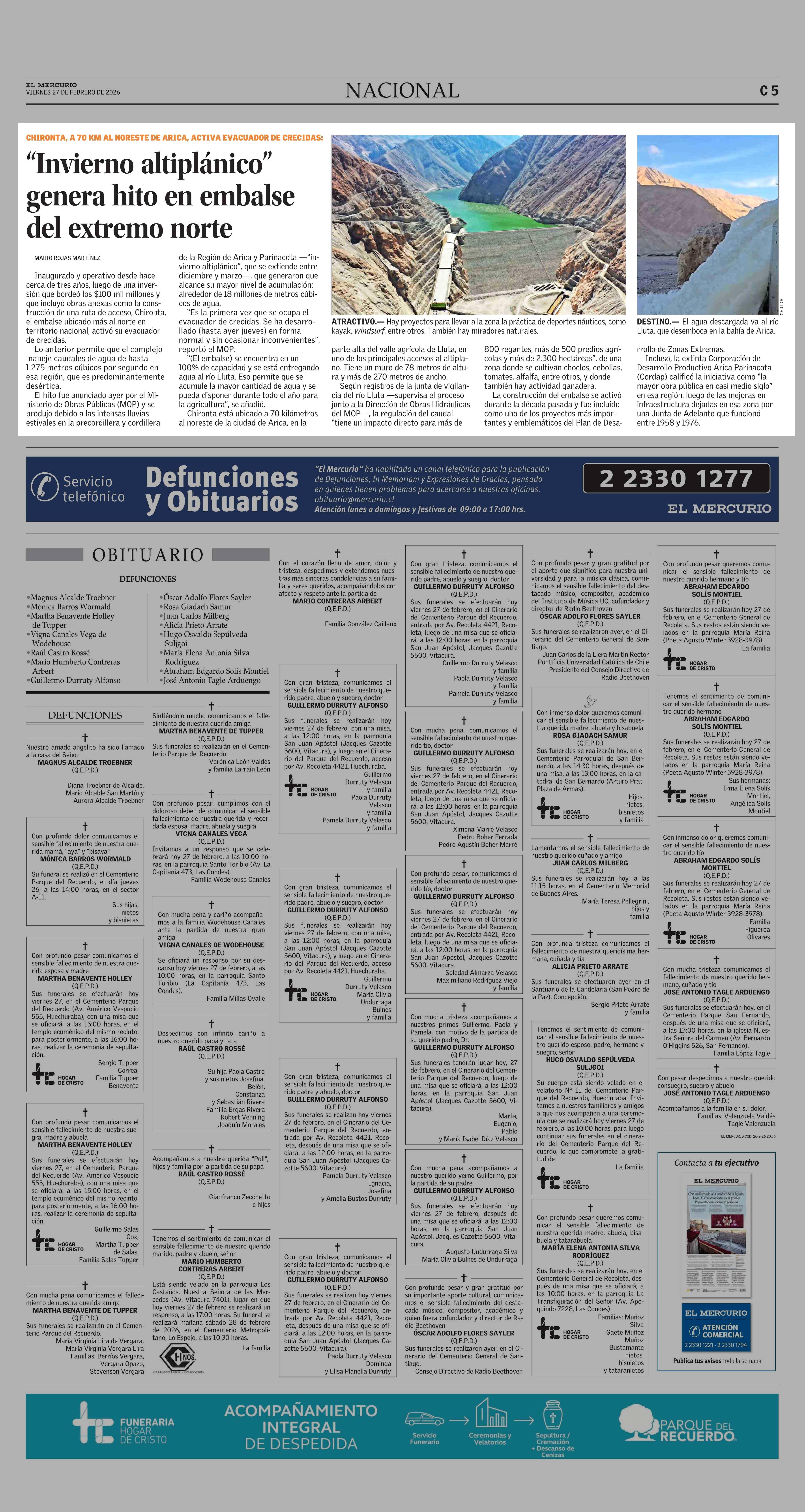 “Invierno altiplánico” genera hito en embalse del extremo norte 27-02-2026 El Mercurio |