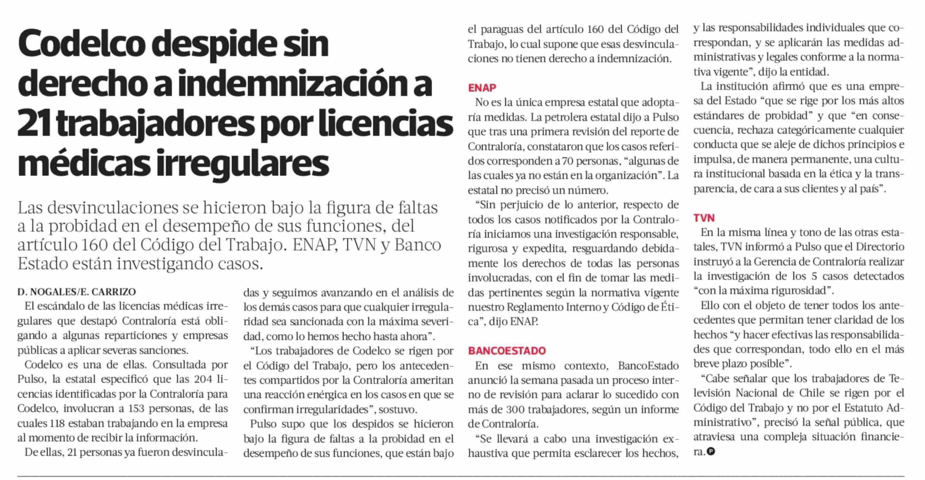 | Título: | Codelco despide sin derecho a indemnización a 21 trabajadores por licencias médicas irregulares |