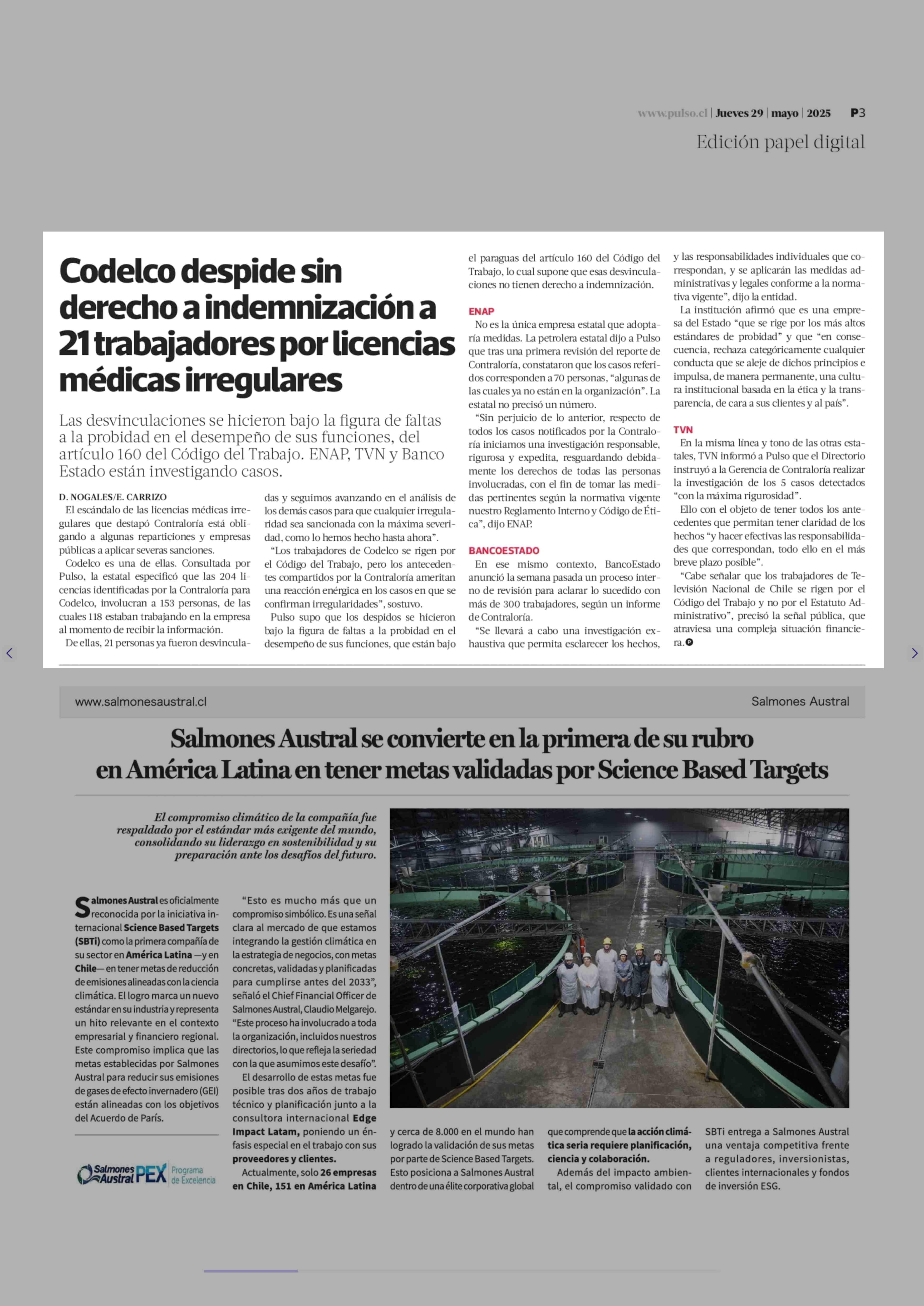 Codelco despide sin derecho a indemnización a 21 trabajadores por licencias médicas irregulares 29-05-2025 La Tercera |