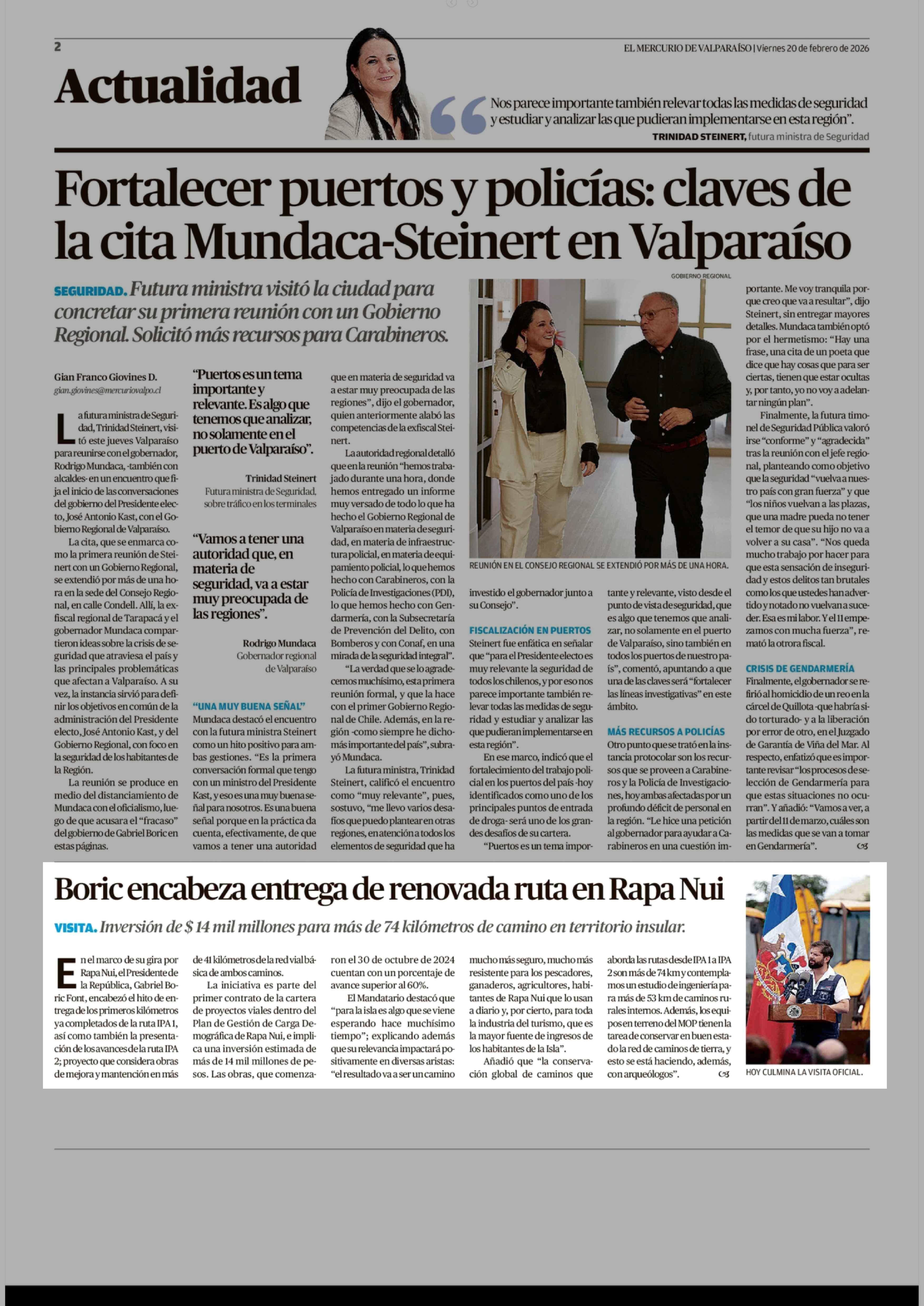 Boric encabeza entrega de renovada ruta en Rapa Nui 20-02-2026 El Mercurio de Valparaíso |