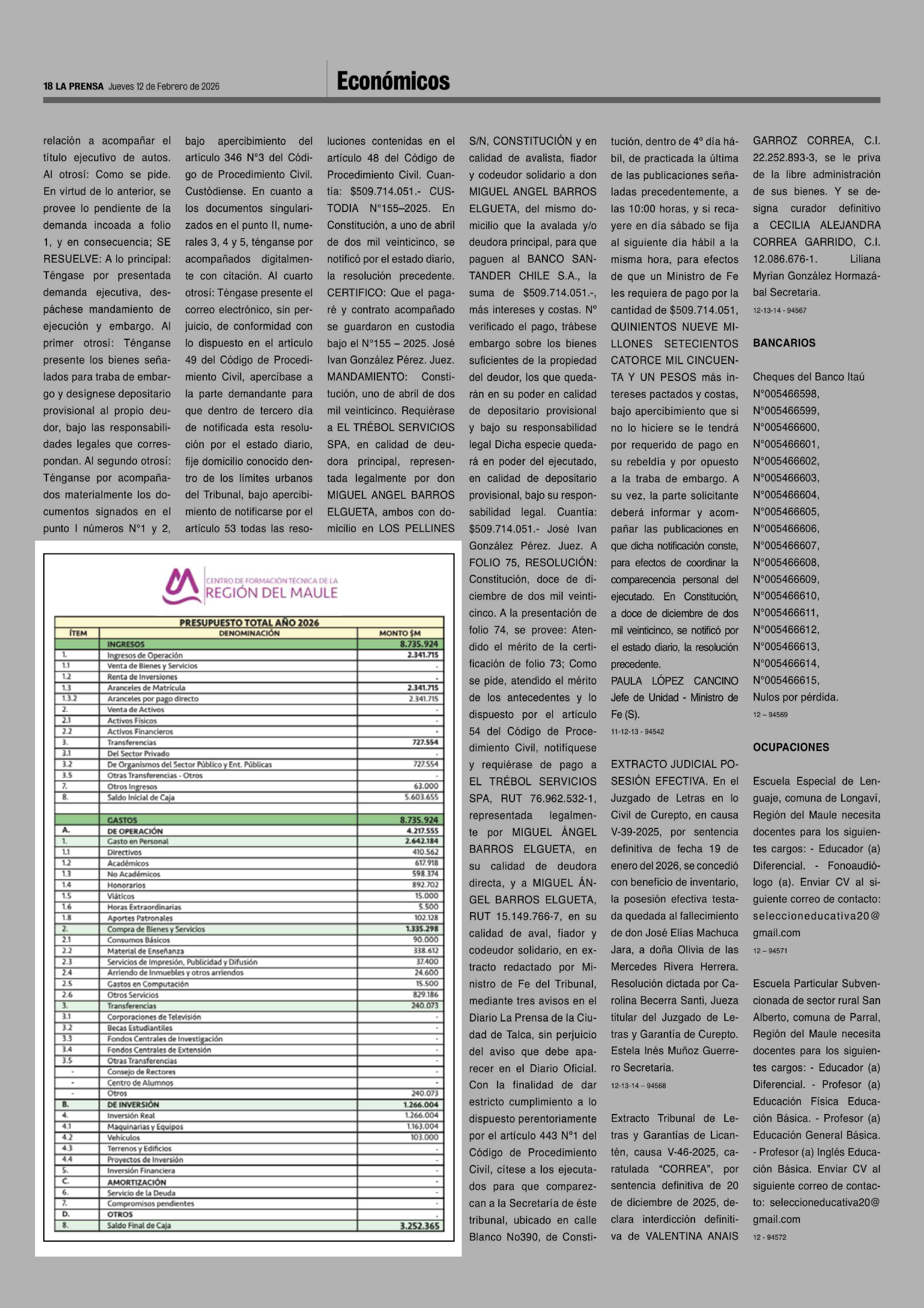 PRESUPUESTO TOTAL AÑO 2026 DENOMINACIÓN INGRESOS 12-02-2026 La Prensa de Curicó |