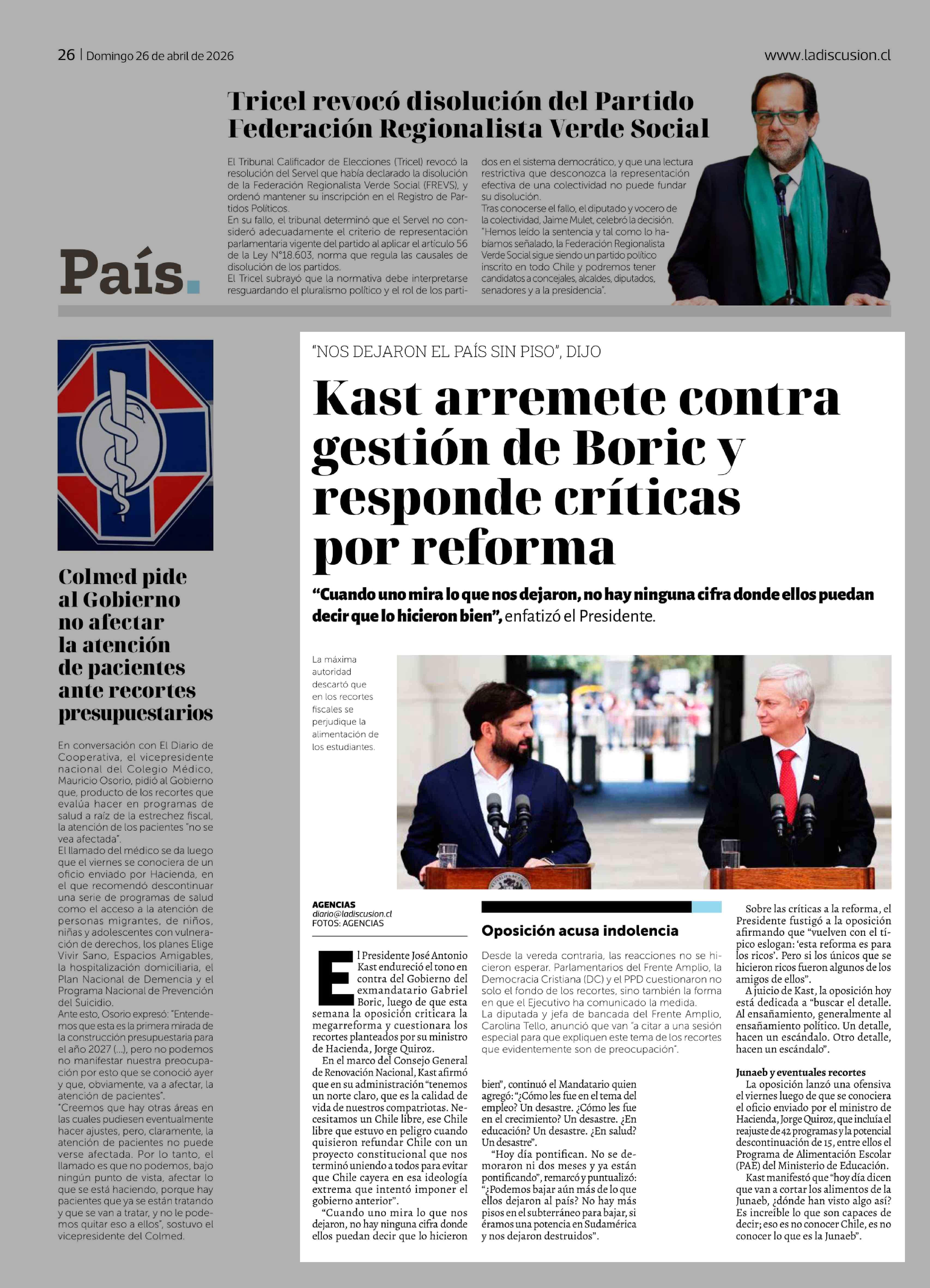 Kast arremete contra gestión de Boric y responde críticas por reforma 26-04-2026 La Discusión |