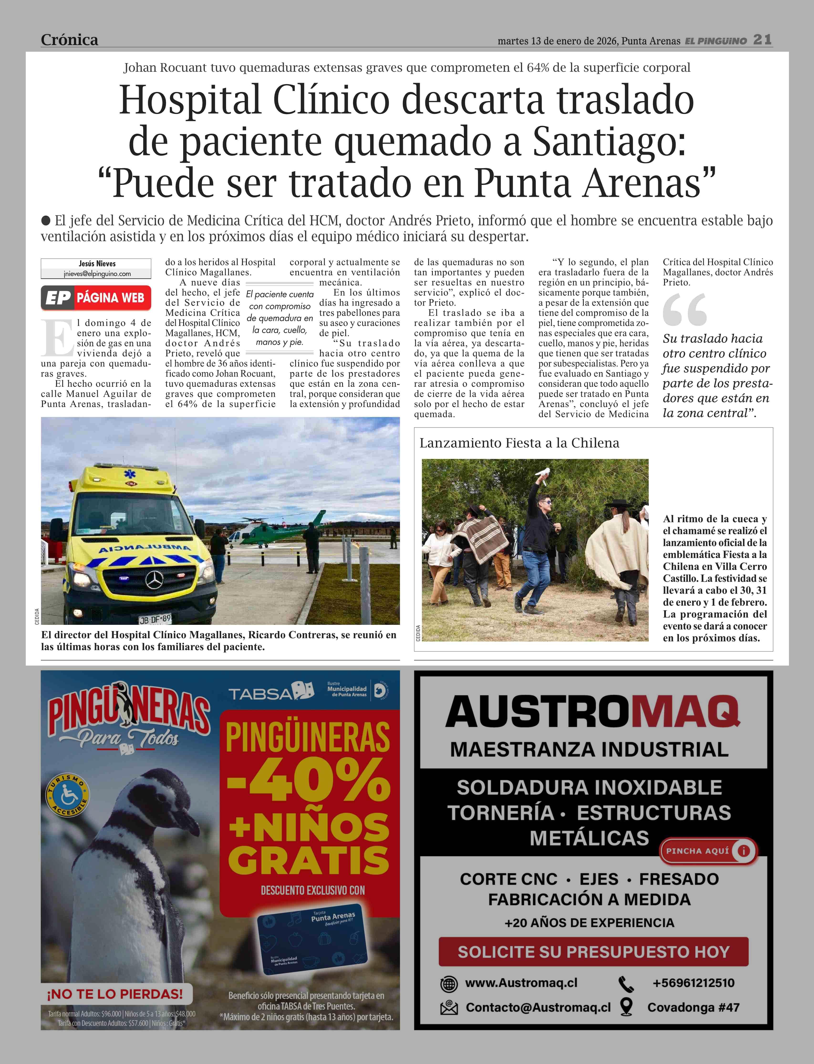 Título: Hospital Clínico descarta traslado de paciente quemado a Santiago: "Puede ser tratado en Punta Arenas"