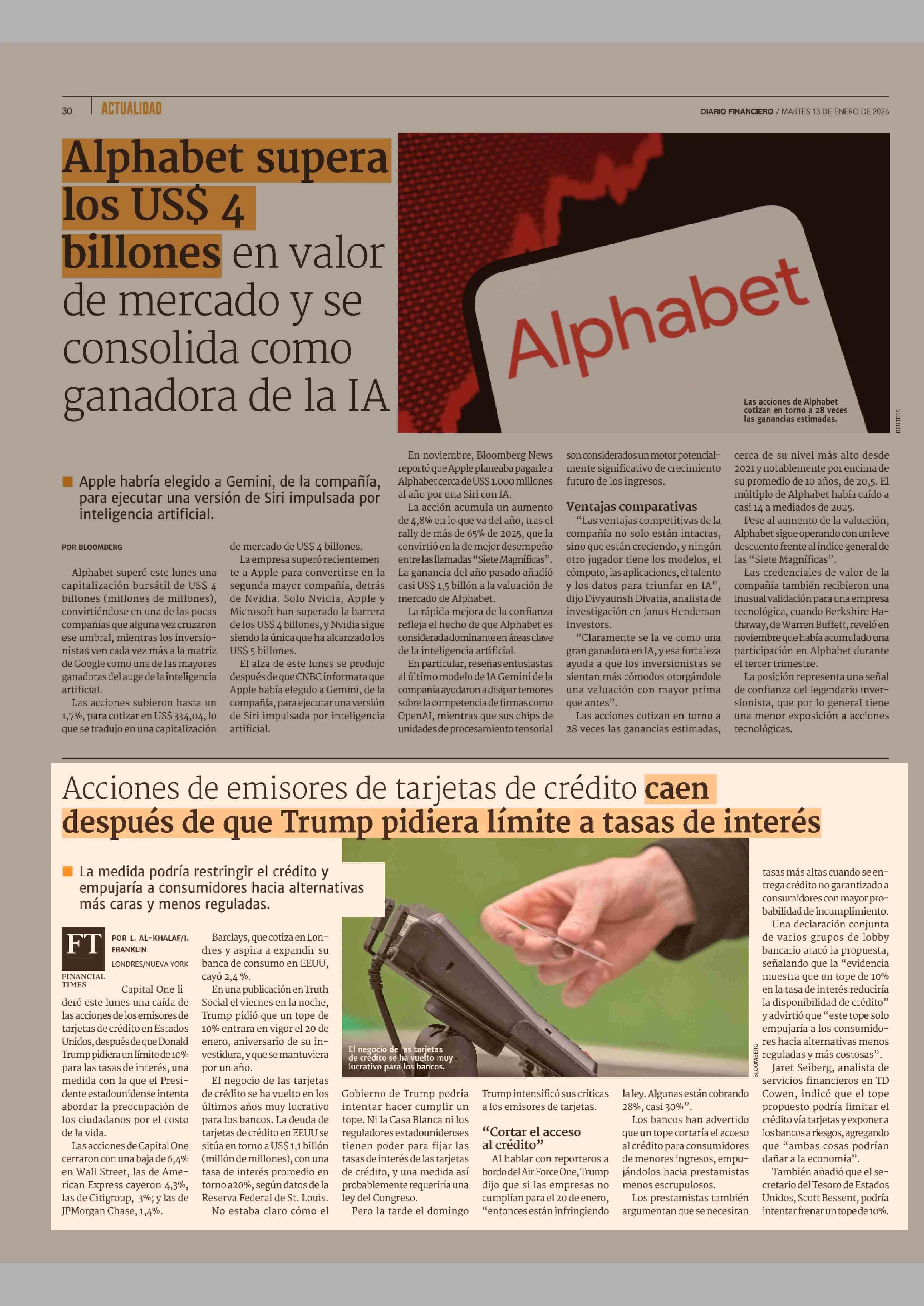 Acciones de emisores de tarjetas de crédito caen después de que Trump pidiera límite a tasas de interés 13-01-2026 Diario Financiero |