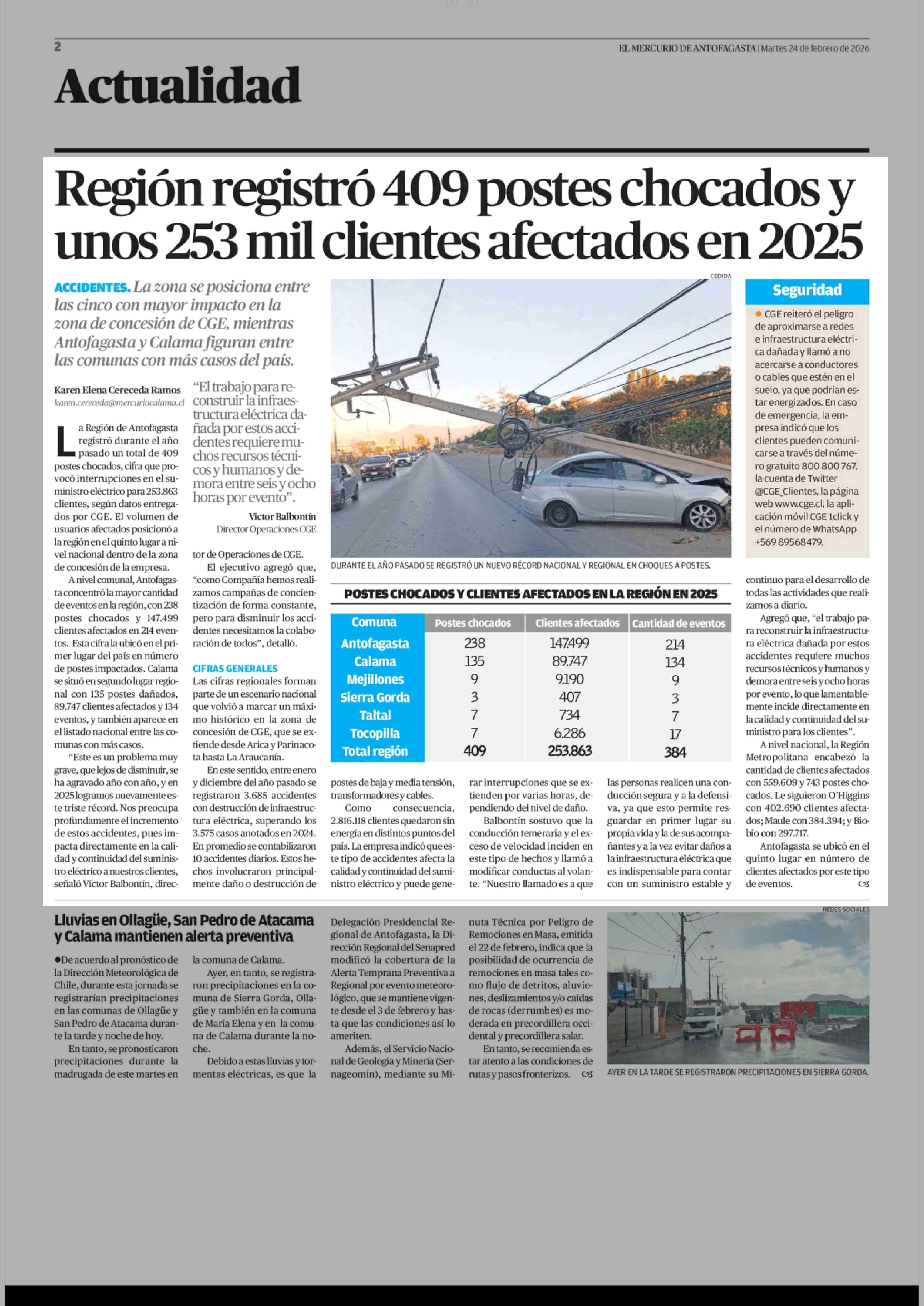 Título: Región registró 409 postes chocados y unos 253 mil clientes afectados en 2025