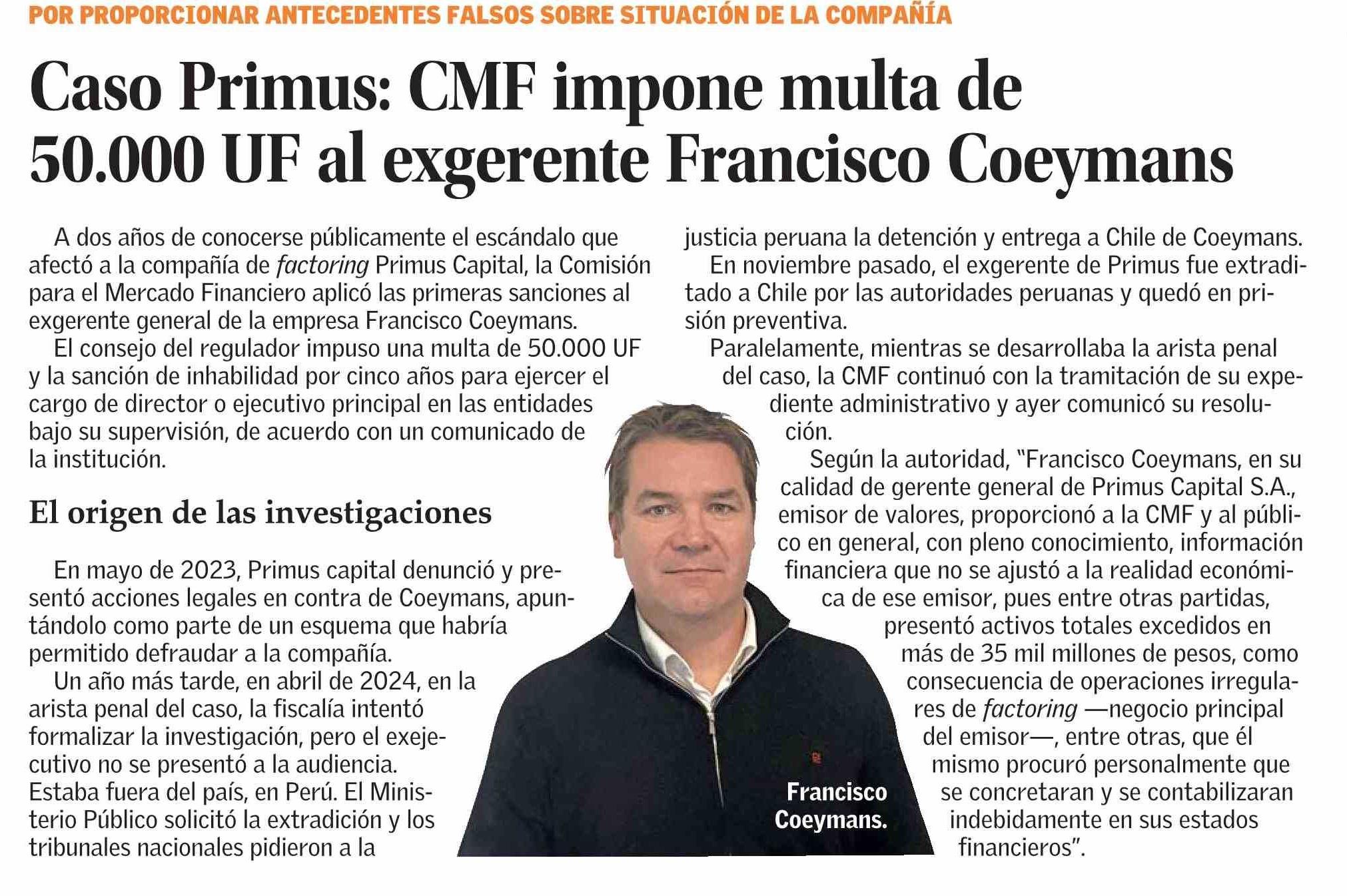 Caso Primus: CMF impone multa de 50.000 UF al exgerente Francisco Coeymans 27-05-2025 El Mercurio |