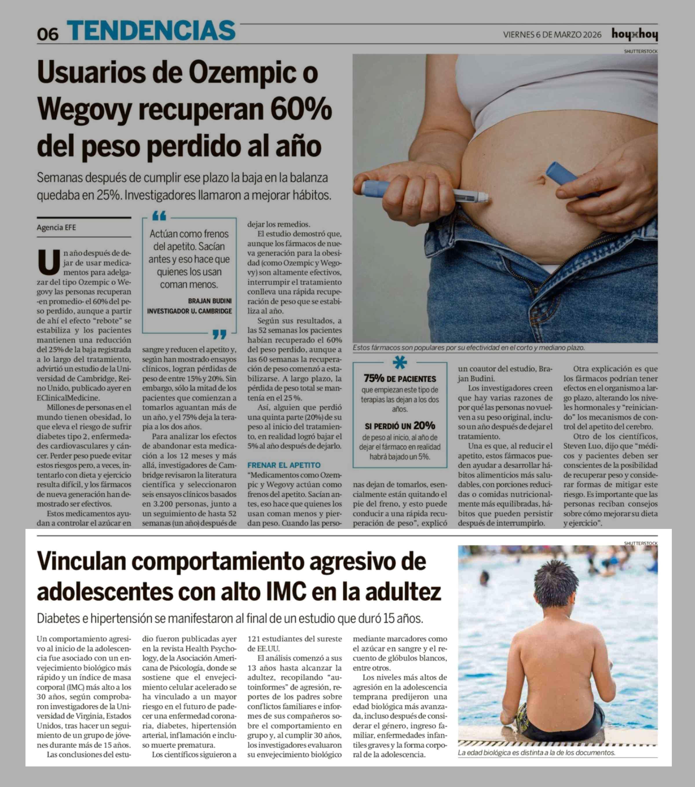 Vinculan comportamiento agresivo de adolescentes con alto IMC en la adultez 06-03-2026 Hoy x Hoy |