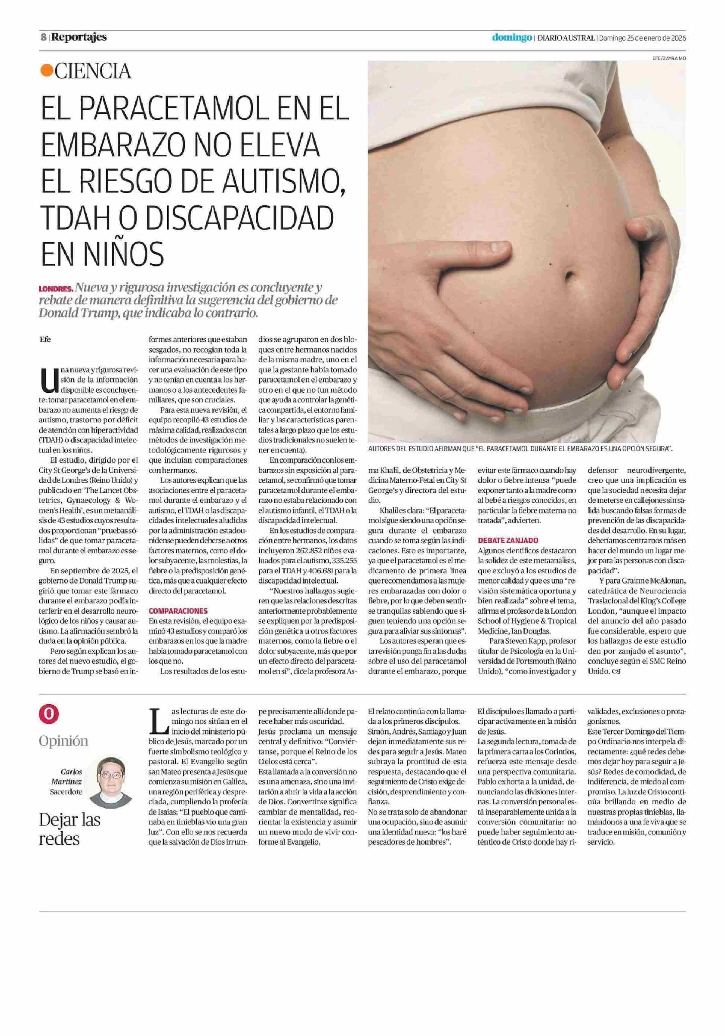 EL PARACETAMOL EN EL EMBARAZO NO ELEVA EL RIESGO DE AUTISMO, TDAH O DISCAPACIDAD EN NIÑOS 25-01-2026 Diario Austral Región de Los Ríos |