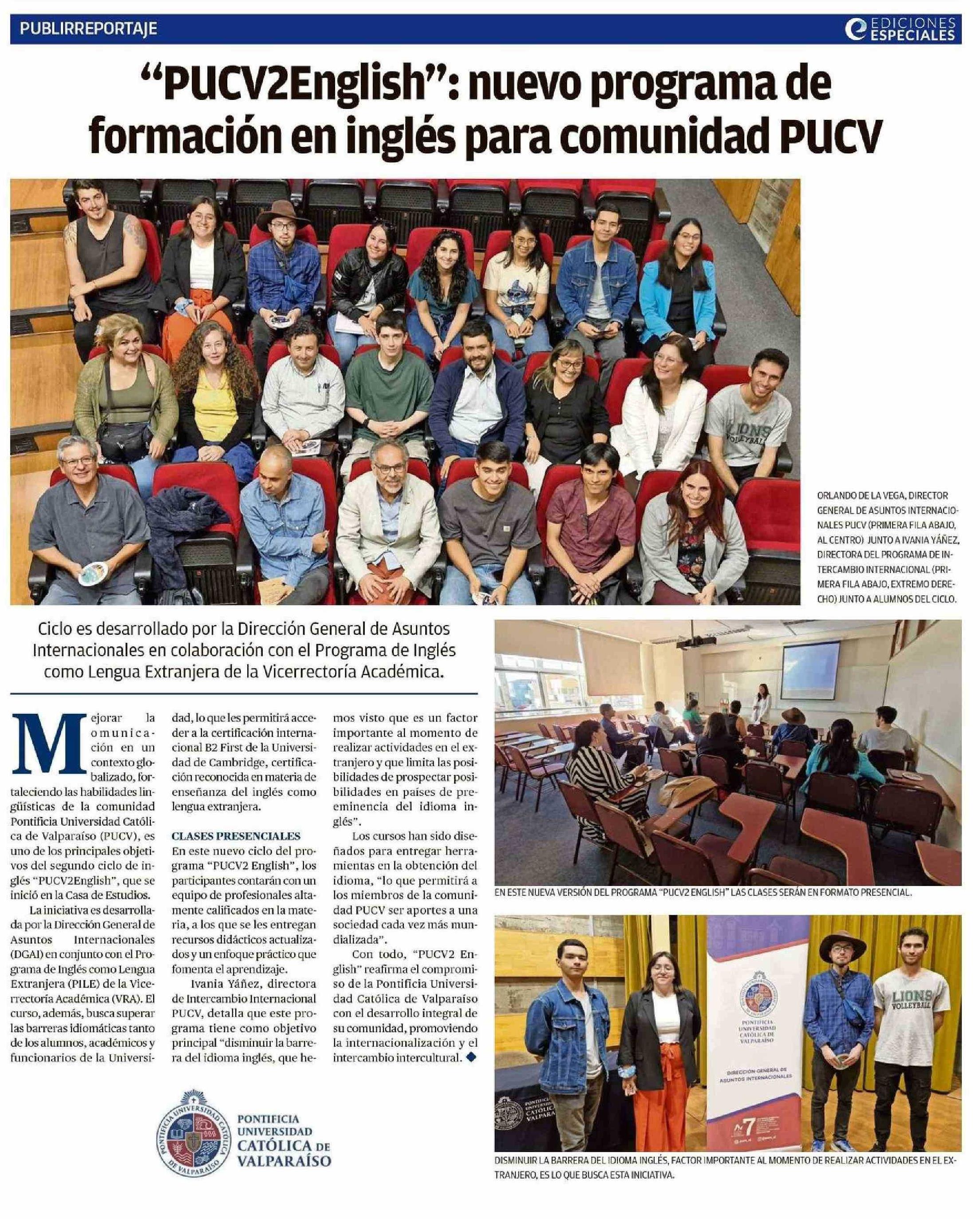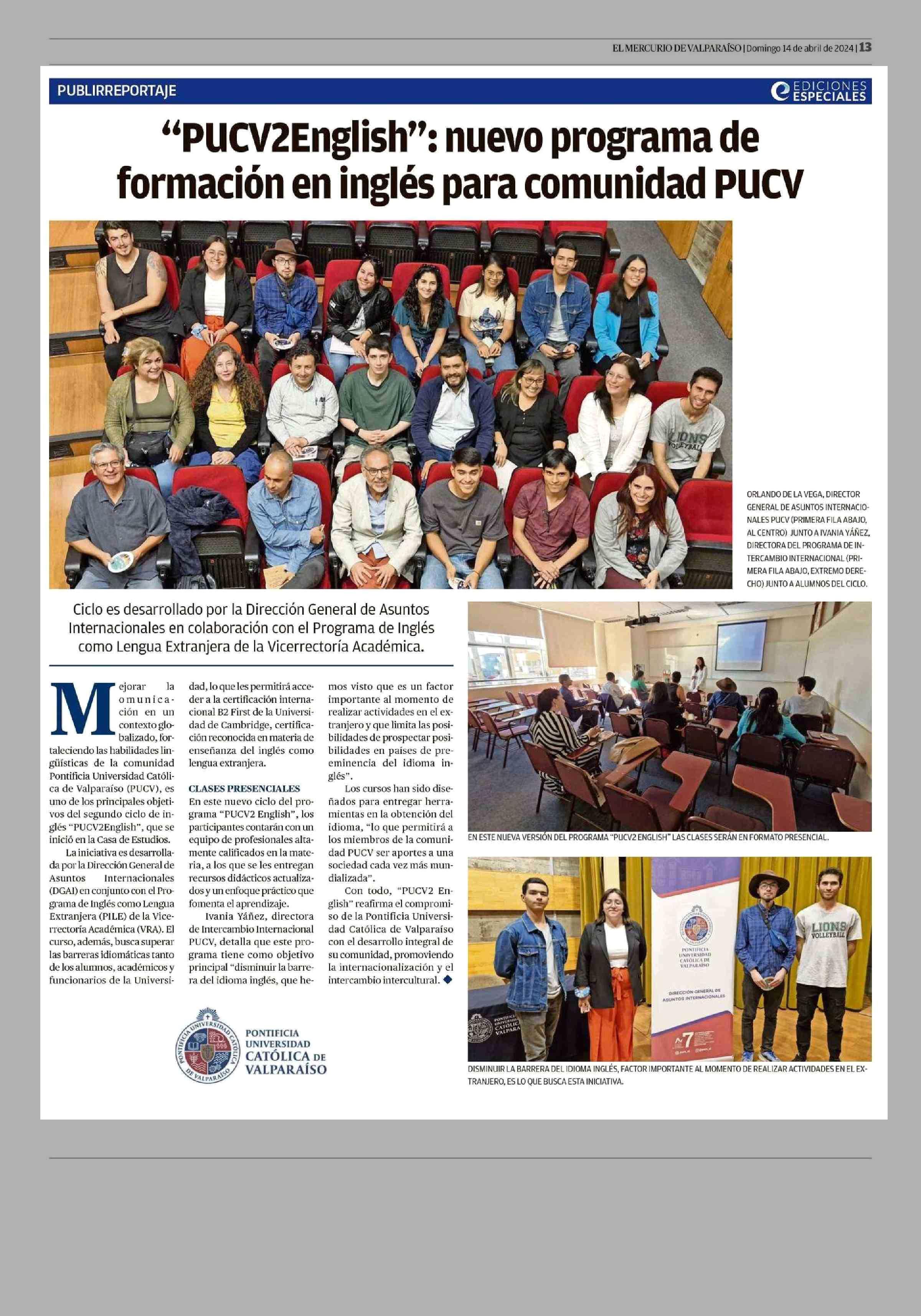 “PUCV2English”: nuevo programa de formación en inglés para comunidad PUCV 14-04-2024 El Mercurio de Valparaíso |