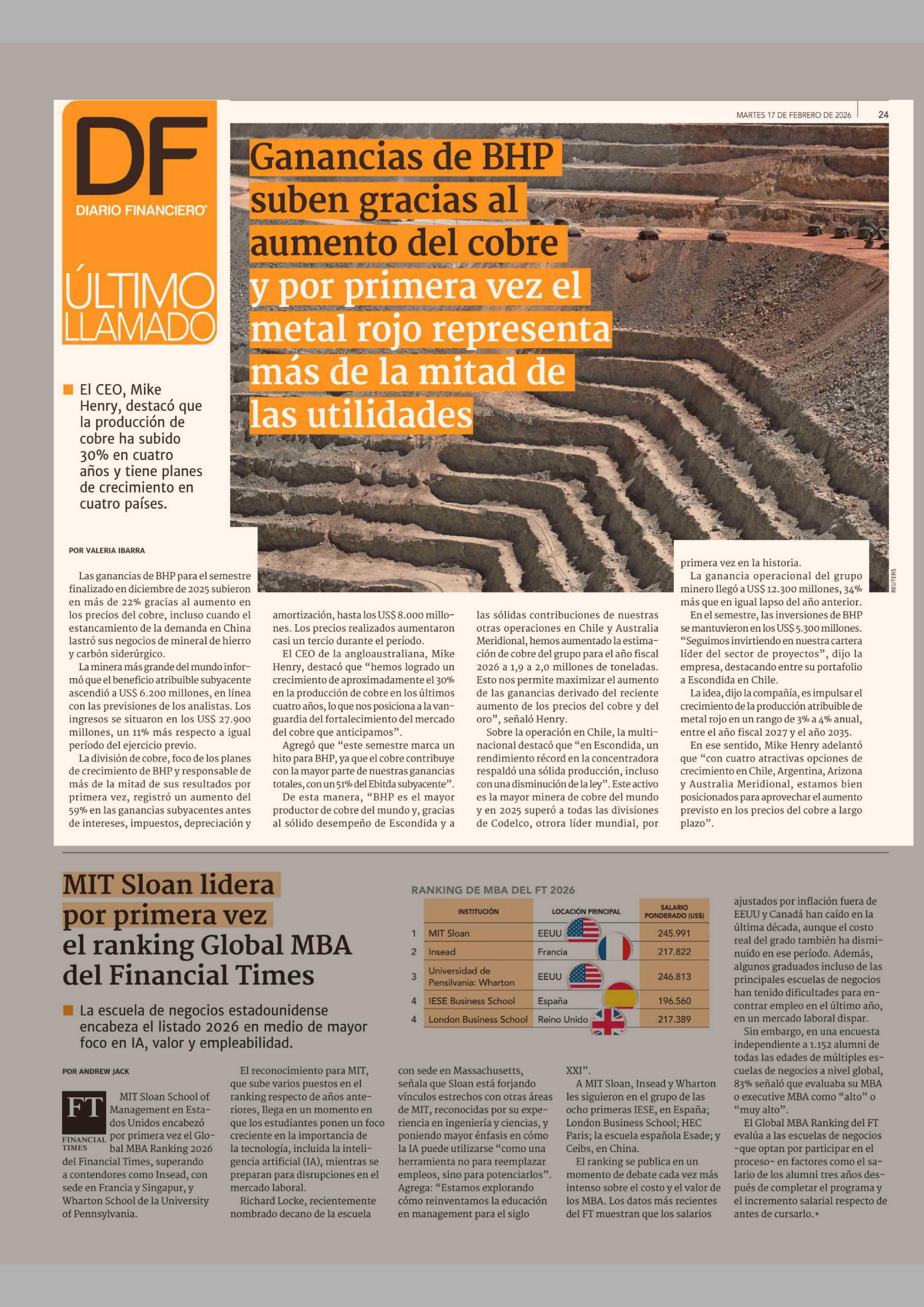 Ganancias de BHP suben gracias al aumento del cobre y por primera vez el metal rojo representa más de la mitad de las utilidades 17-02-2026 Diario Financiero |