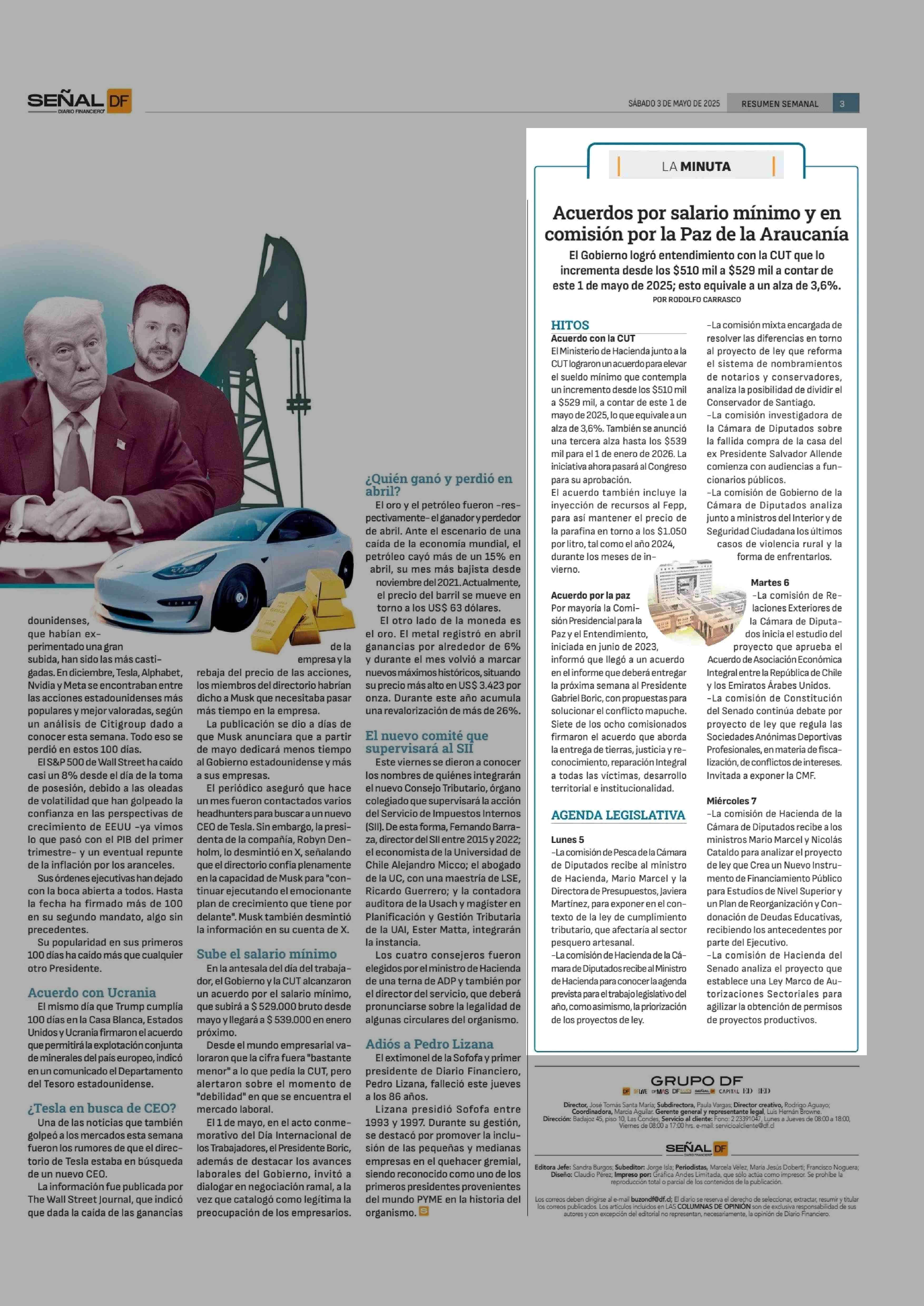 Acuerdos por salario mínimo y en comisión por la Paz de la Araucanía 03-05-2025 Diario Financiero |