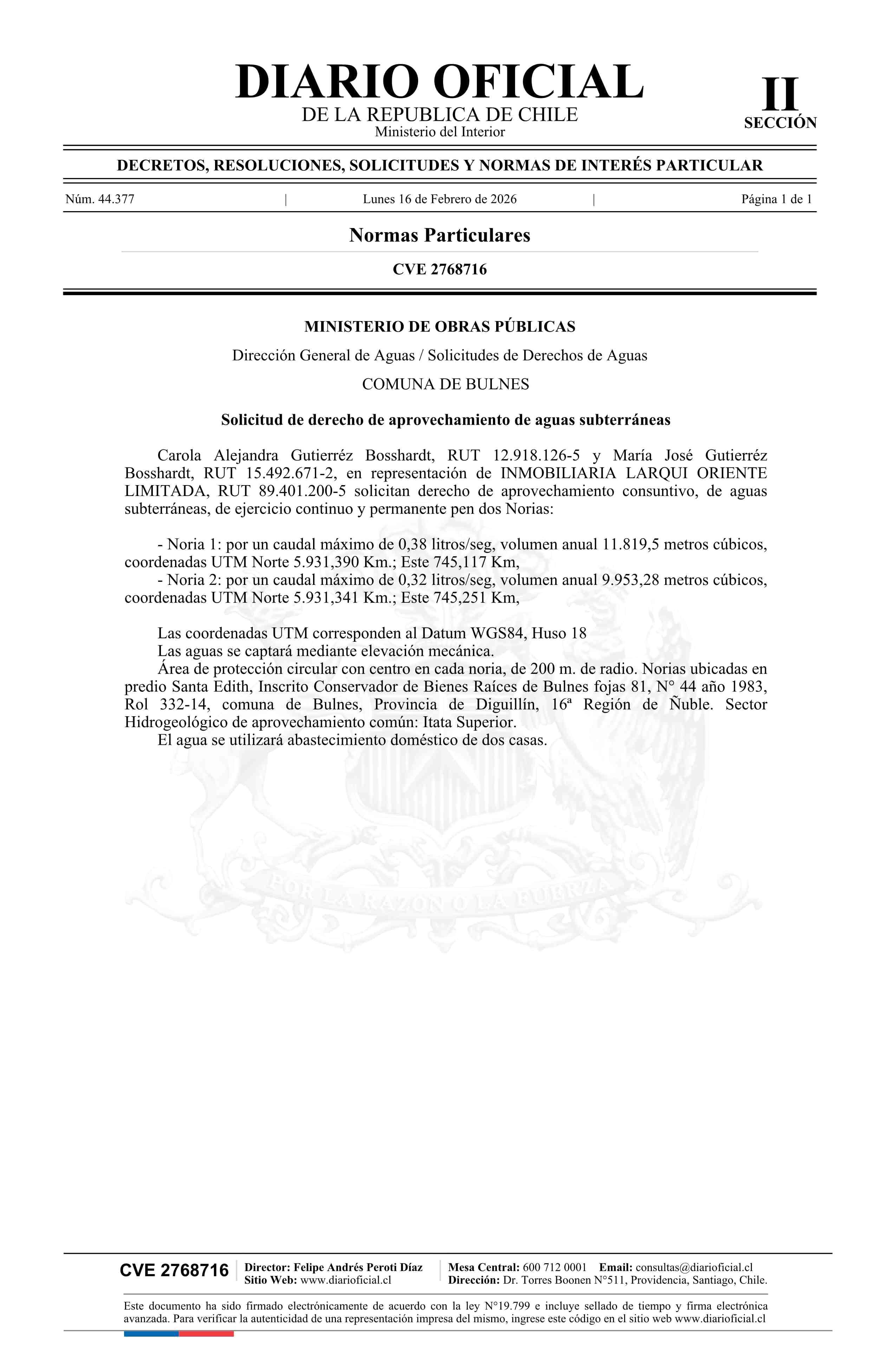 Solicitud Inmobiliaria Larqui Oriente Limitada 16-02-2026 Diario Oficial Edición Electrónica |
