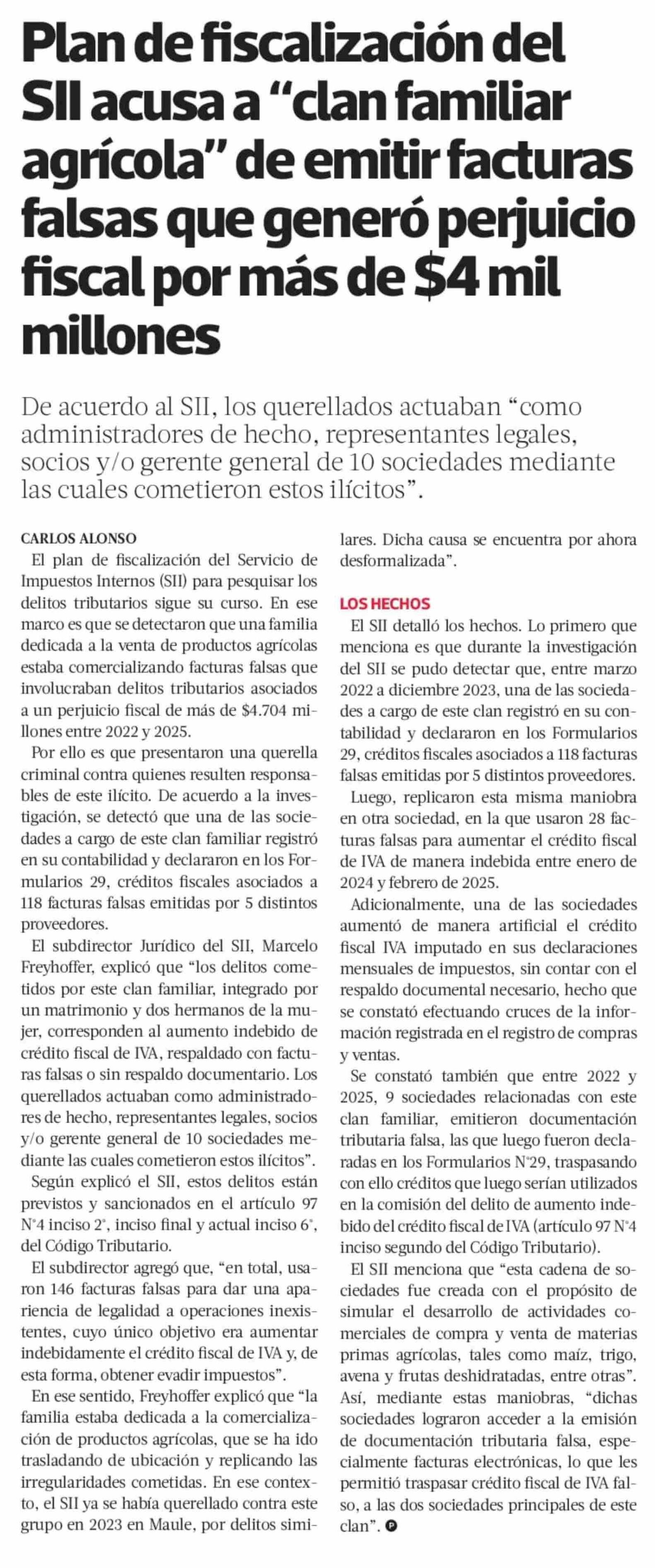 Plan de fiscalización del SII acusa a "clan familiar agrícola" de emitir facturas falsas que generó perjuicio fiscal por más de $4 mil millones 16-01-2026 La Tercera |