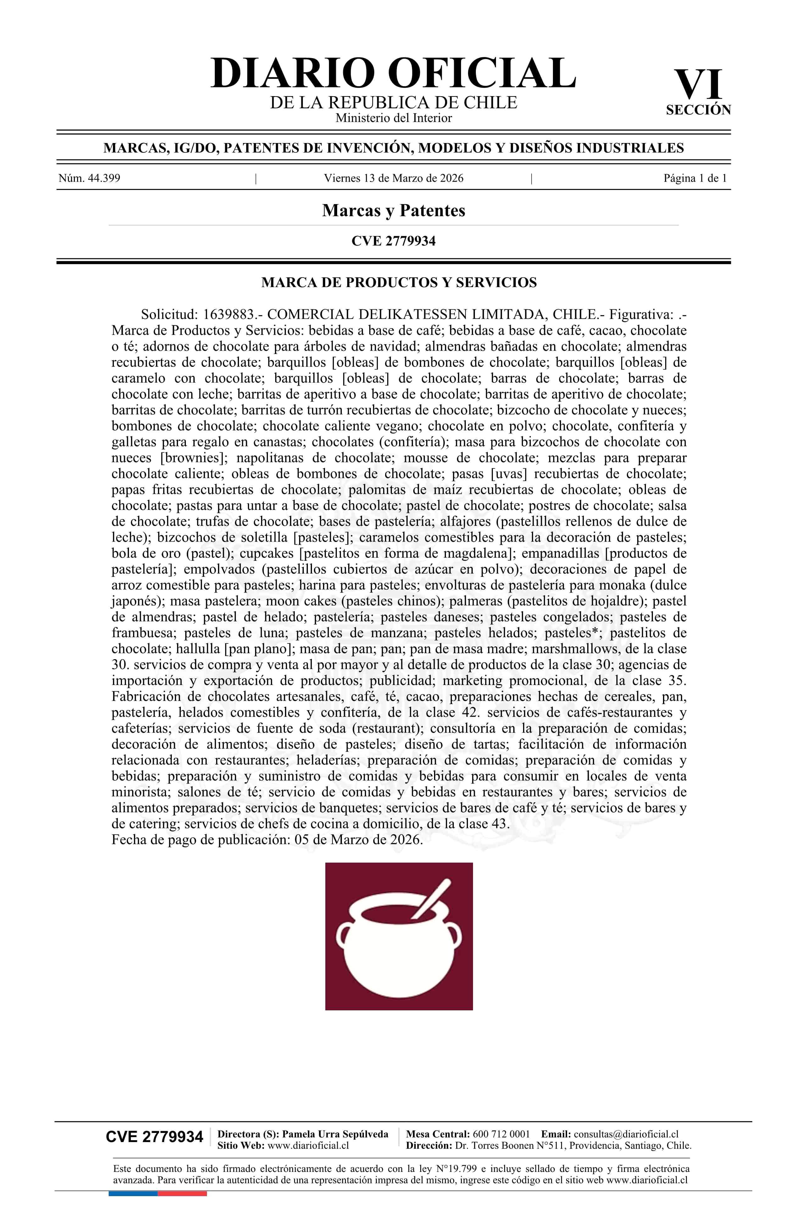 Solicitud número 1639883.- COMERCIAL DELIKATESSEN LIMITADA 13-03-2026 Diario Oficial Edición Electrónica |